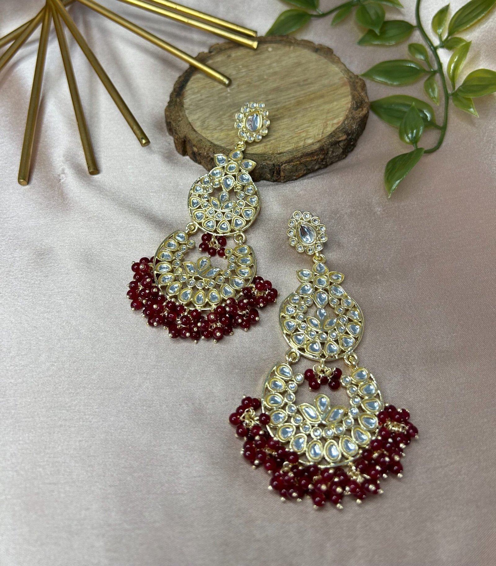 Introducing Aabha Earrings in a stunning Maroon Color. Perfect for weddings, these stylish and elegant earrings are sure to make a statement. Add a touch of sophistication to any outfit with Aabha.