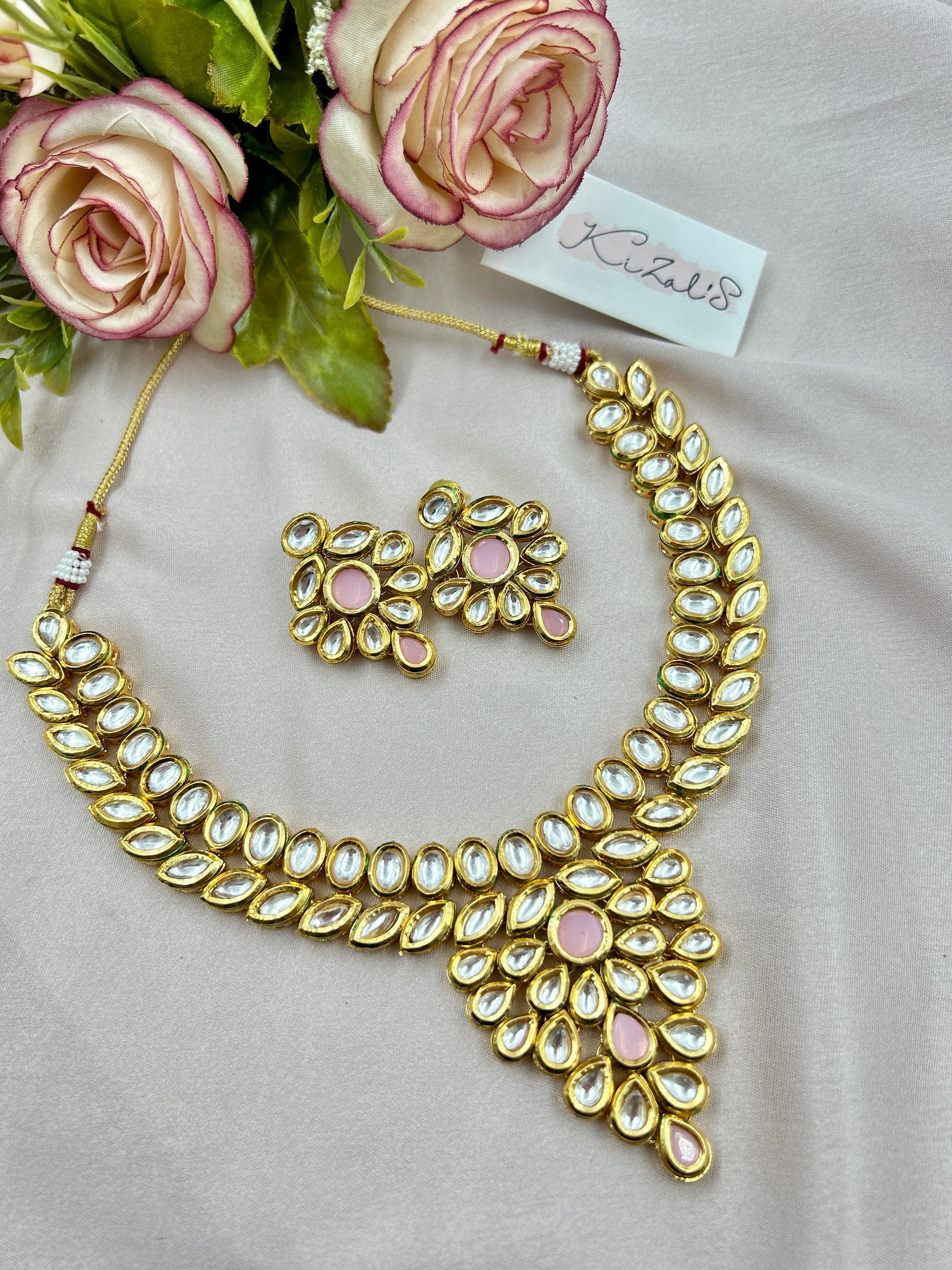 Discover the elegance of the Adhija Kundan Necklace in Pink. This sophisticated piece boasts a stunning back meenakari finish, making it an evergreen addition to any jewelry collection. Graceful and pocket friendly, it's the perfect accessory for any occasion.