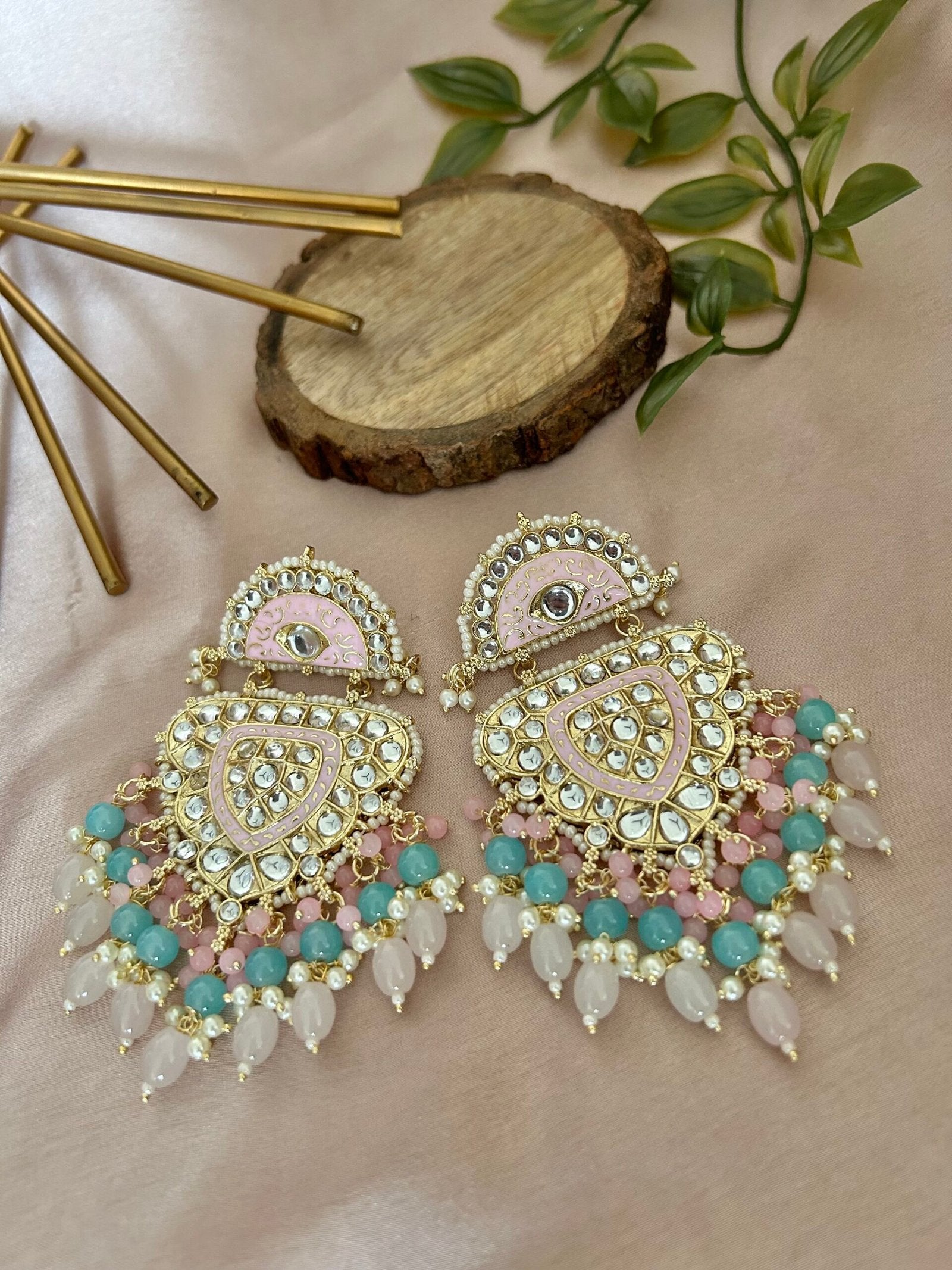 Expertly crafted, Advika earrings showcase beautiful Kundan and Meenkari work in a versatile and sophisticated design. The dual tone adds a touch of elegance to any outfit. Adorn yourself with these timeless pieces for a look that exudes style and class.