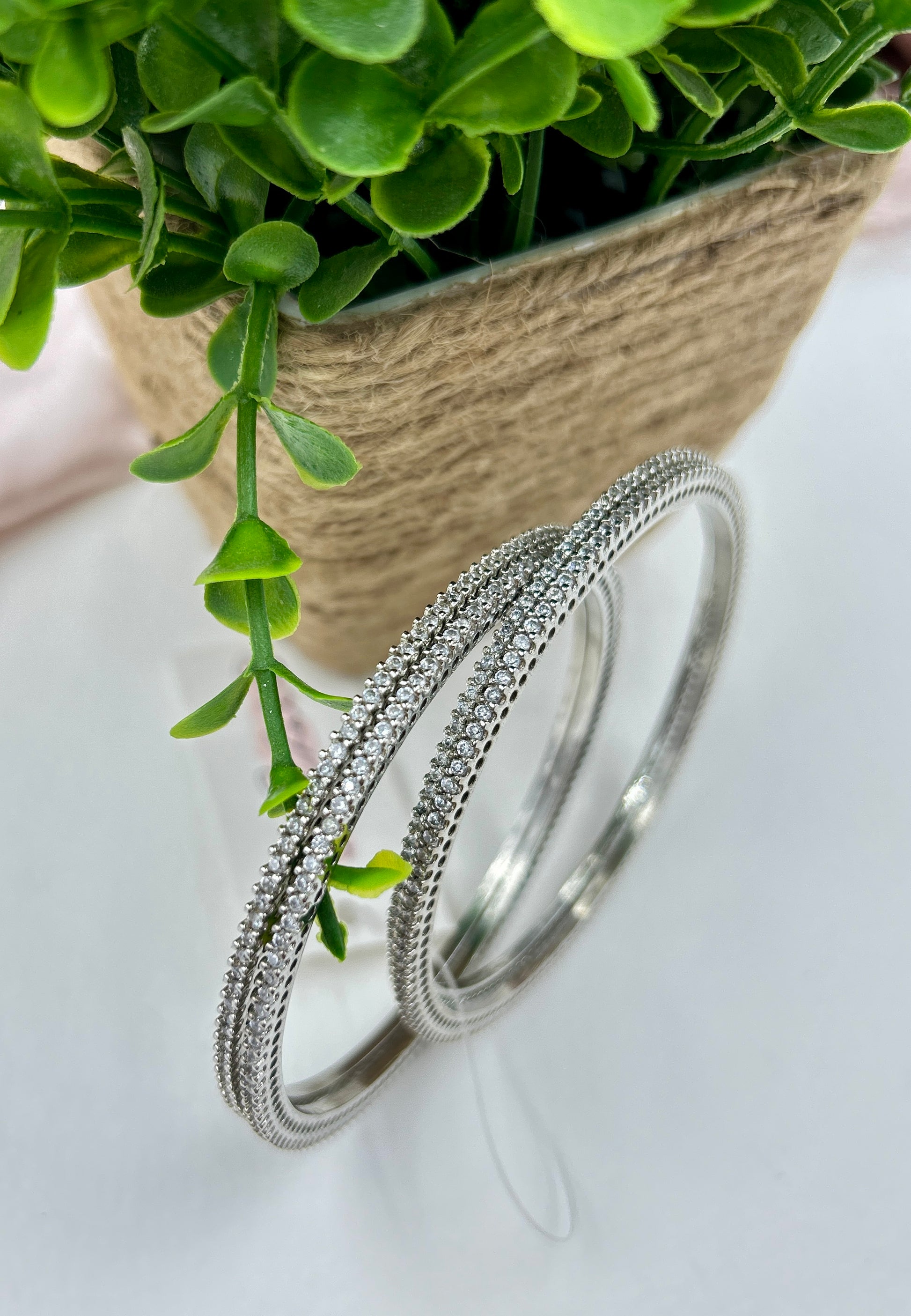 Elevate your style with the Aleena AD bangles. This set of 4 bangles features exquisite American Diamonds, renowned for its brilliance and durability. The high quality silver rhodium polish adds a touch of luxury, while the smooth and delicate design exudes elegance. Enhance any outfit with these stunning, expertly crafted bangles.