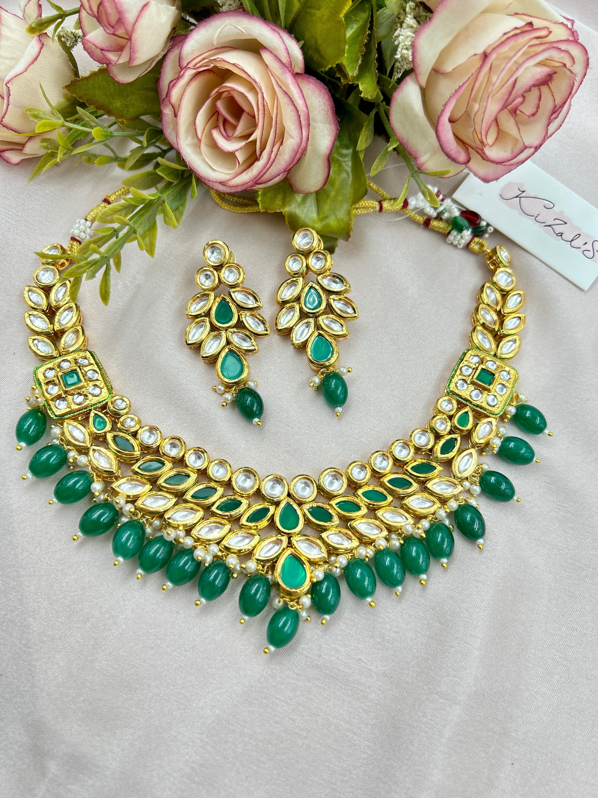 Introducing our Ambika Kundan Necklace in Green. This sophisticated piece features a stunning back meenakari finish that elevates any look. It's timeless, evergreen design is both stylish and pocket friendly. Made for the modern woman seeking a touch of elegance.