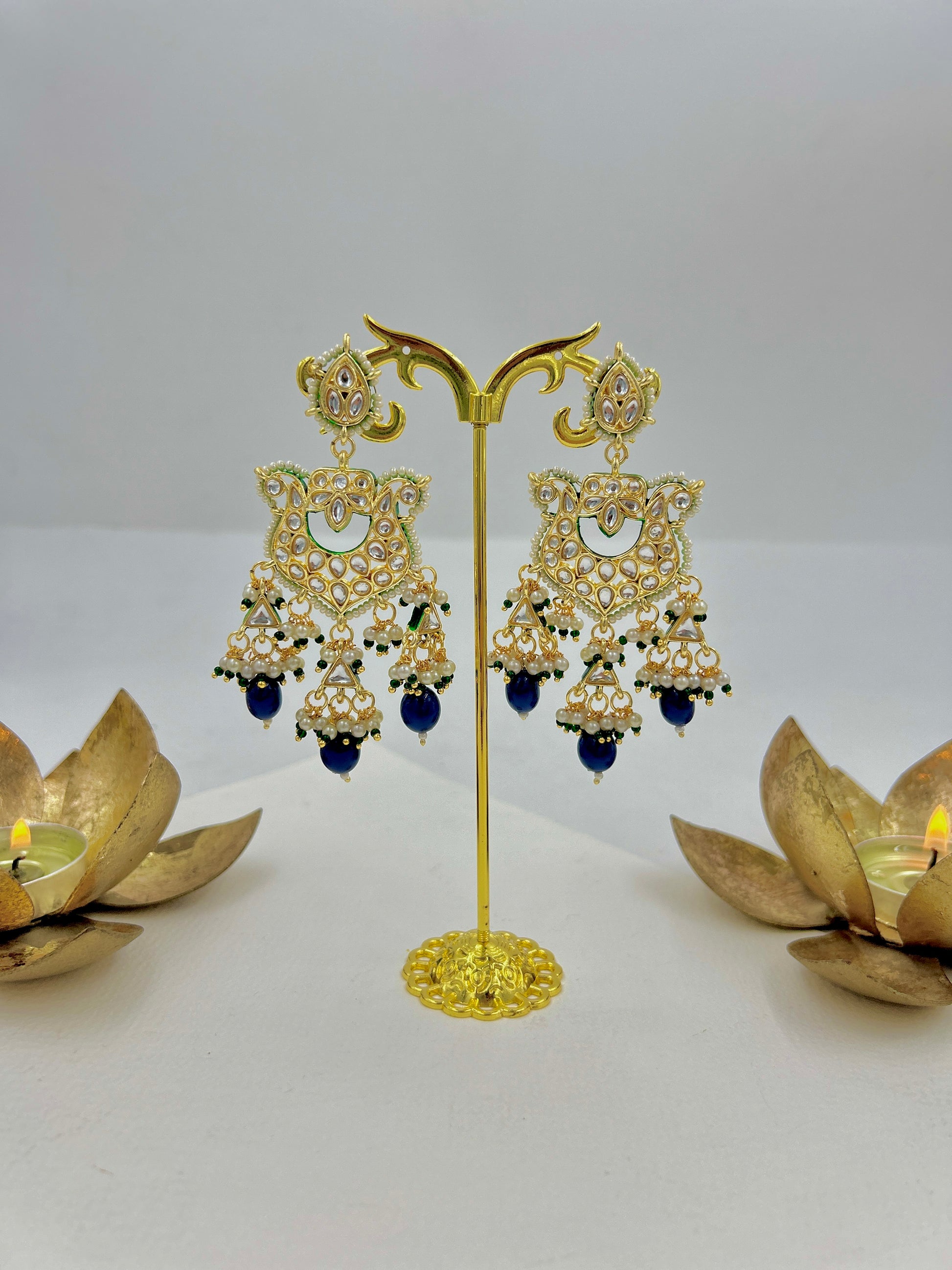 These elegant Anahita earrings are a perfect blend of traditional and modern design elements. Made with Kundan stones and Meenakari touch, they come in eleven stunning colors to complement any outfit. Lightweight and detailed with pearls, they offer a touch of sparkle without weighing you down.