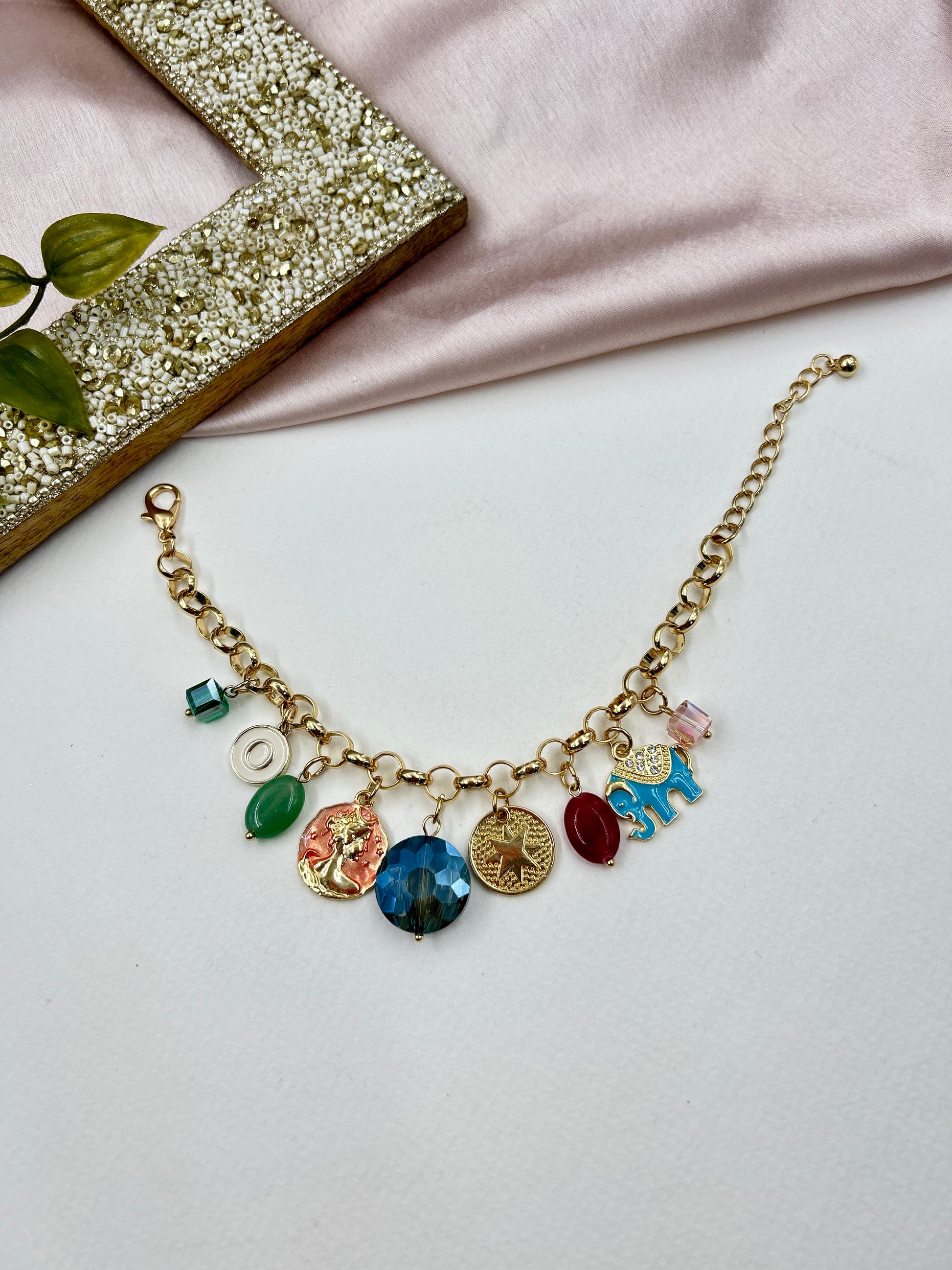 Introducing the Charms Bracelet - a trendy and unique accessory perfect for any fashionista. Made with 18k gold plating, it boasts anti-tarnish and waterproof properties for enduring beauty. Hypoallergenic for sensitive skin, this bracelet will elevate any outfit with its Paris inspired design.