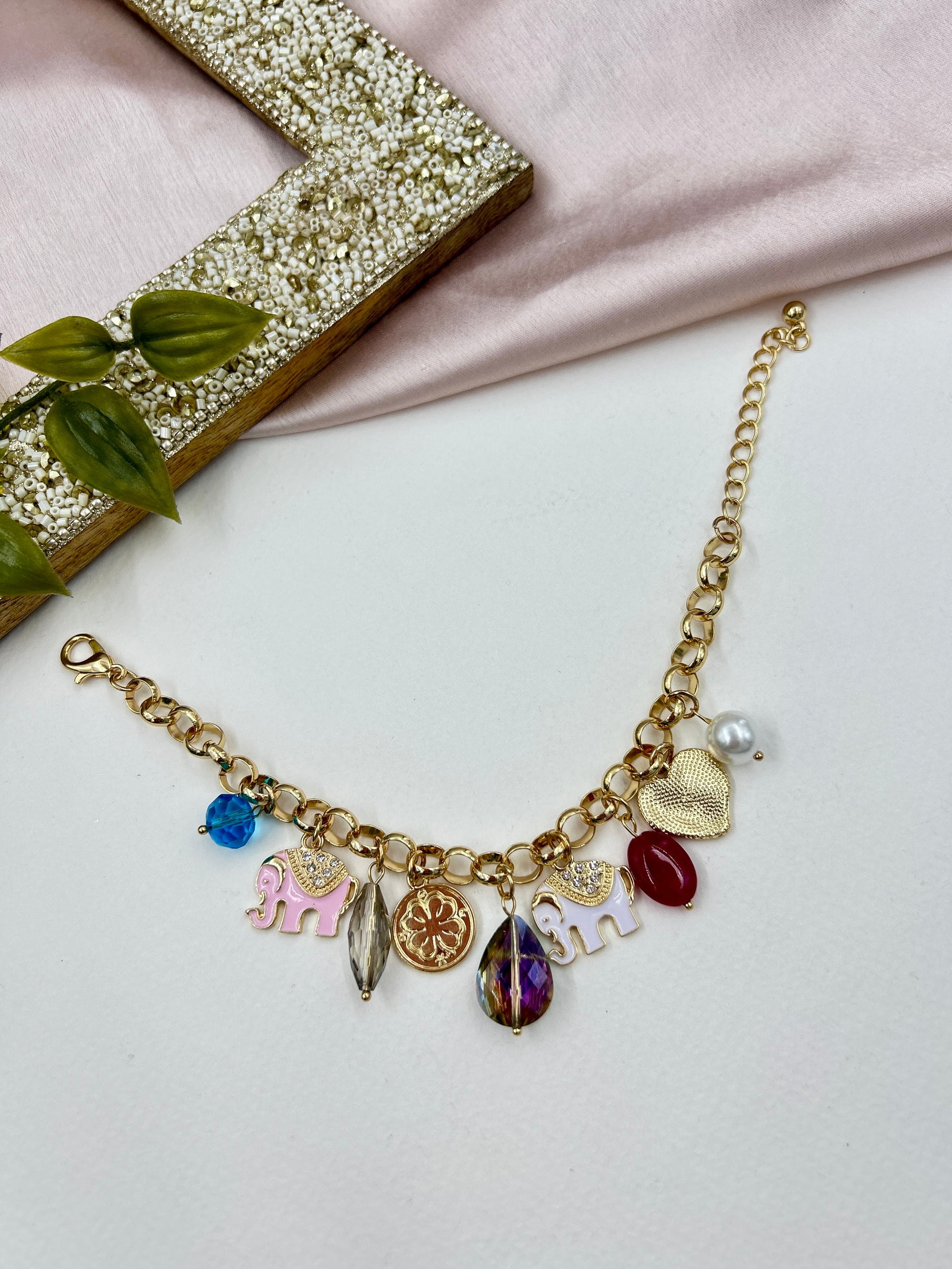 Introducing the Charms Bracelet - a trendy and unique accessory perfect for any fashionista. Made with 18k gold plating, it boasts anti-tarnish and waterproof properties for enduring beauty. Hypoallergenic for sensitive skin, this bracelet will elevate any outfit with its Paris inspired design.