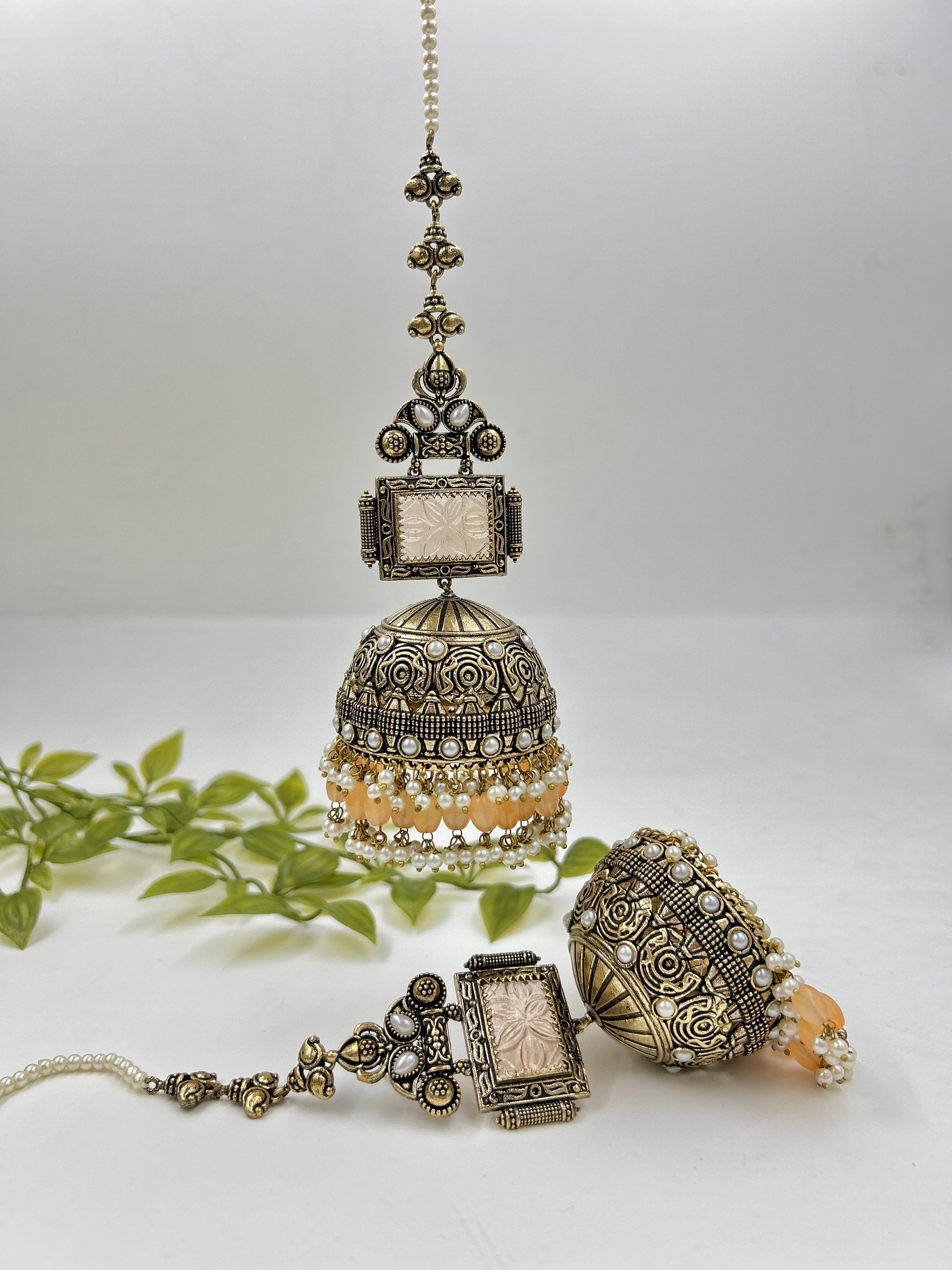 Expertly crafted, the Jhoomer Jumbo Jhumka is a statement wear piece that is sure to make you stand out. With its antique polish and superb pear detailing, this show stopper jhumka is perfect for those who love bold and glamorous accessories. The added pearl sahara provides support for comfortable wear. Get the celebrity look with this viral design.