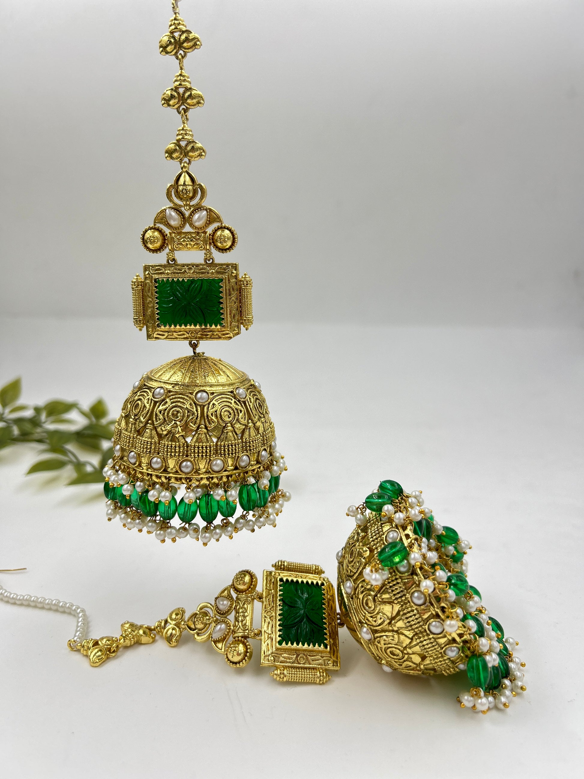 Expertly crafted, the Jhoomer Jumbo Jhumka is a statement wear piece that is sure to make you stand out. With its antique polish and superb pear detailing, this show stopper jhumka is perfect for those who love bold and glamorous accessories. The added pearl sahara provides support for comfortable wear. Get the celebrity look with this viral design.