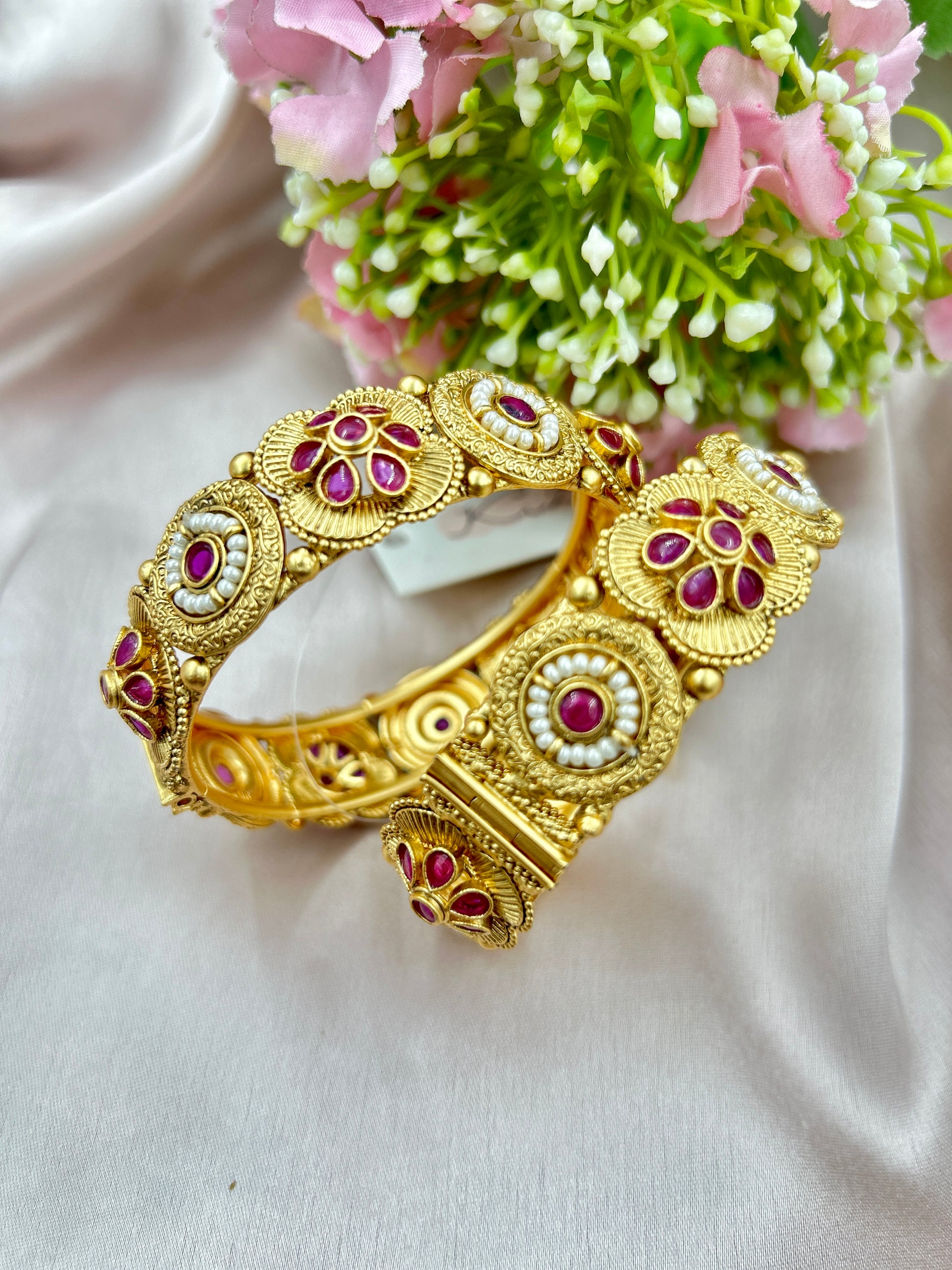 This Kamini Kada bangle features exquisite Rajwada styling with a trendy screw open design. Its beautiful Rani pink color and intricate detailing are complemented by elegant pearl accents. Crafted to resemble gold, this bangle is a luxurious addition to any jewelry collection.