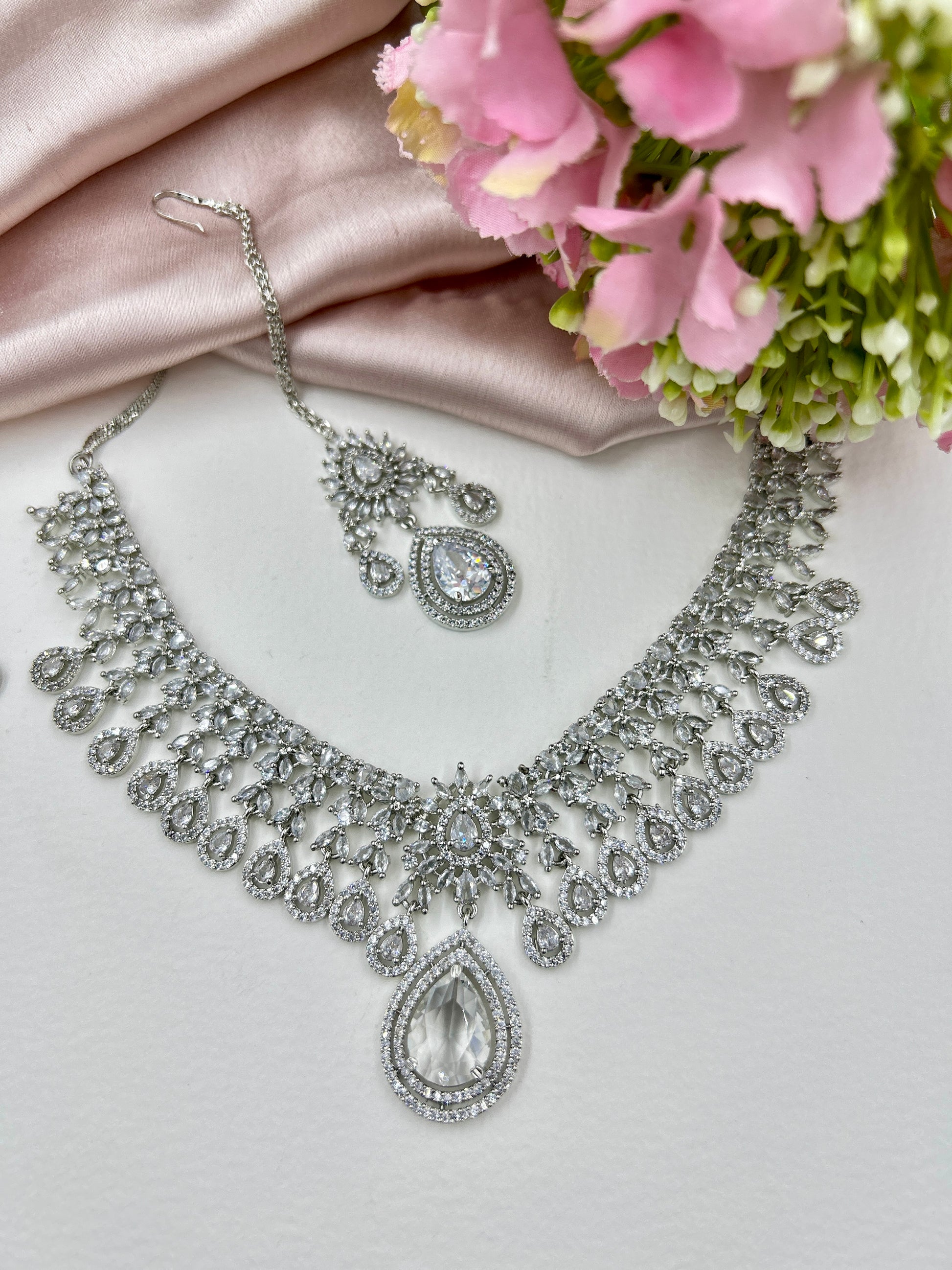 Kavya AD Necklace Set : Clear (Necklace+Earrings+Maang Teeka)