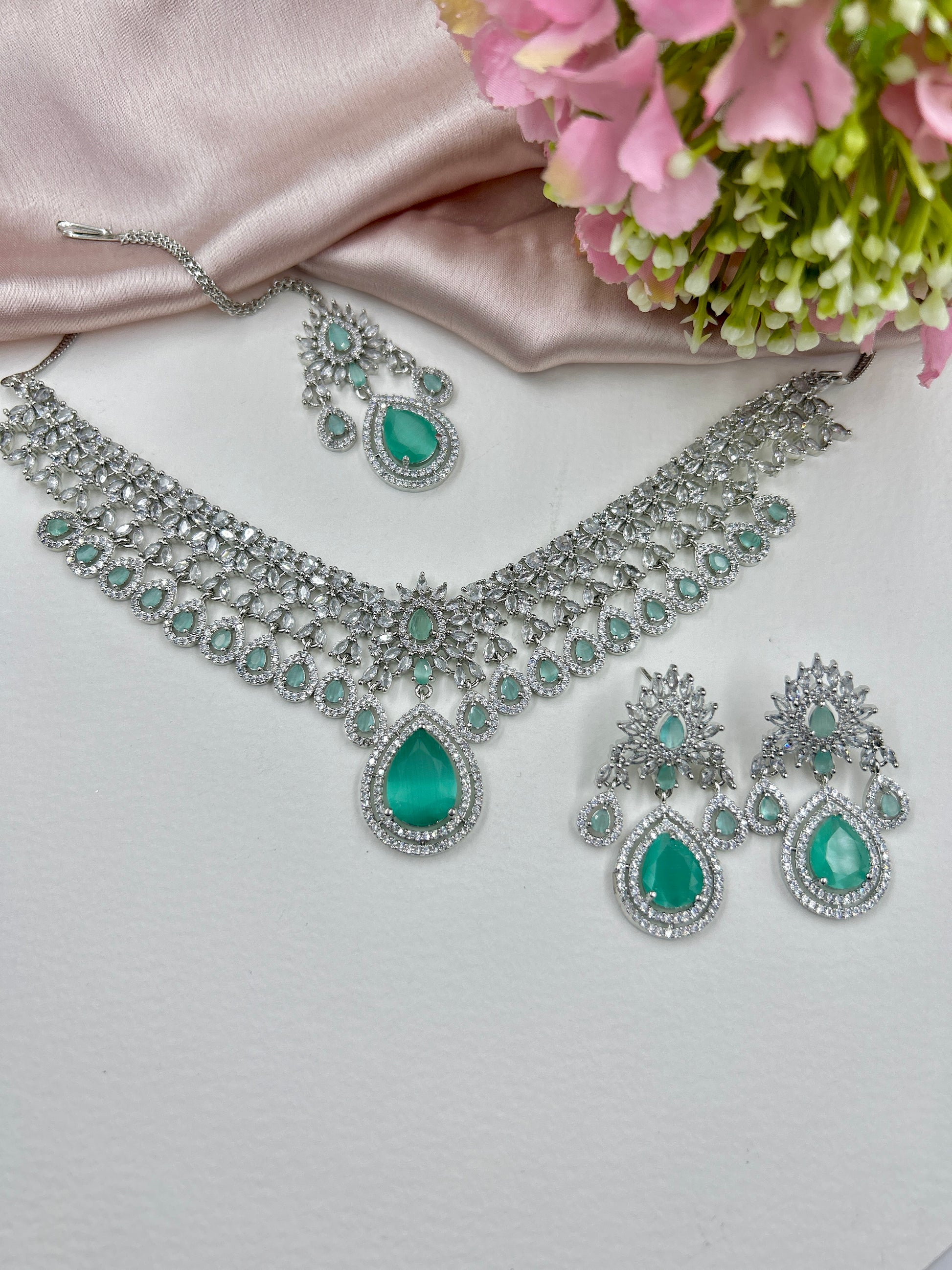 Kavya AD Necklace Set : Mint (Necklace+Earrings+Maang Teeka)