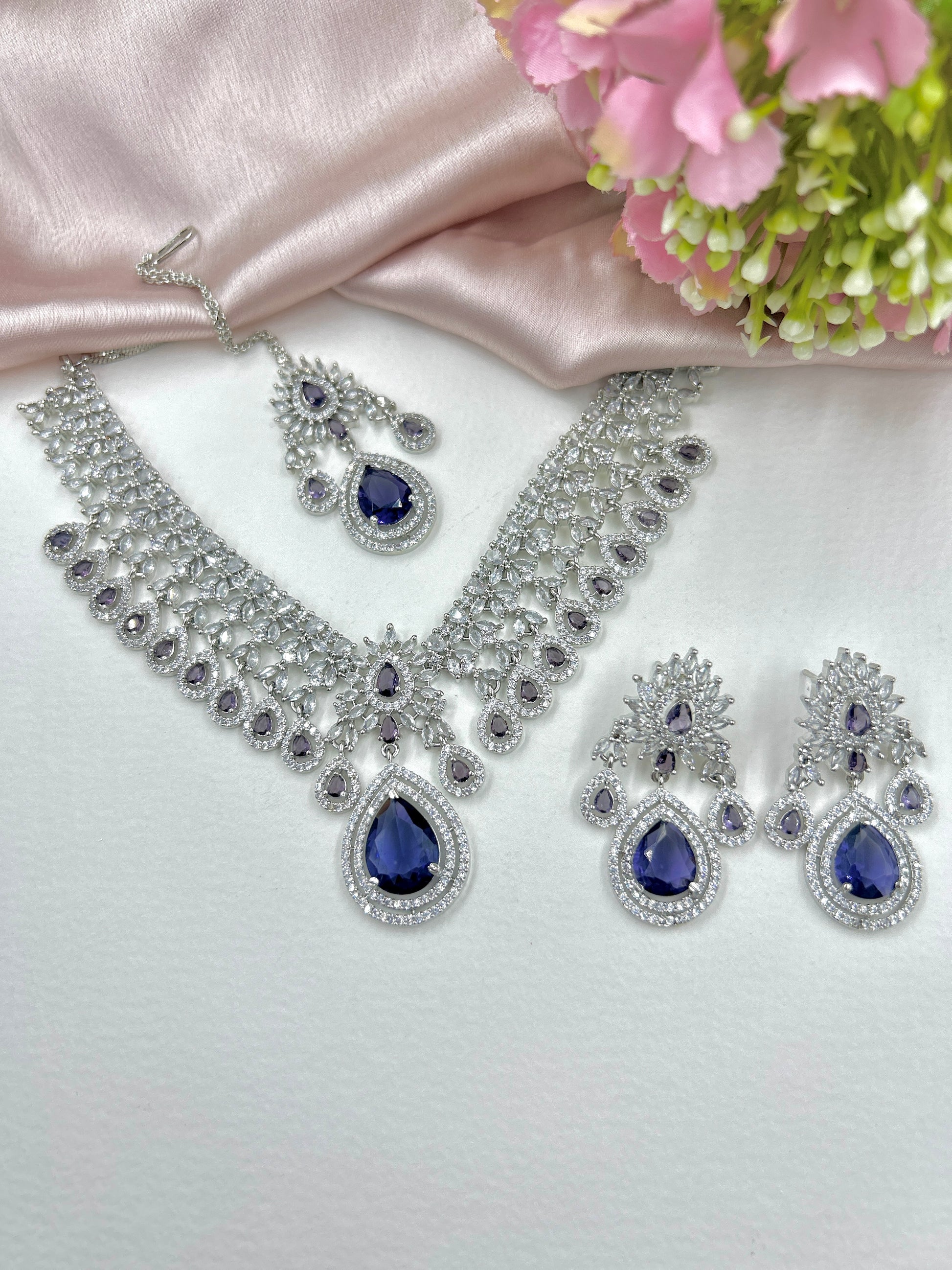 This Kavya AD Necklace Set features a premium silver rhodium polish and high quality finish. Embellished with sparkling American Diamonds, this complete set includes a necklace, earrings, and maang teeka. Elevate any look with this elegant and versatile accessory.