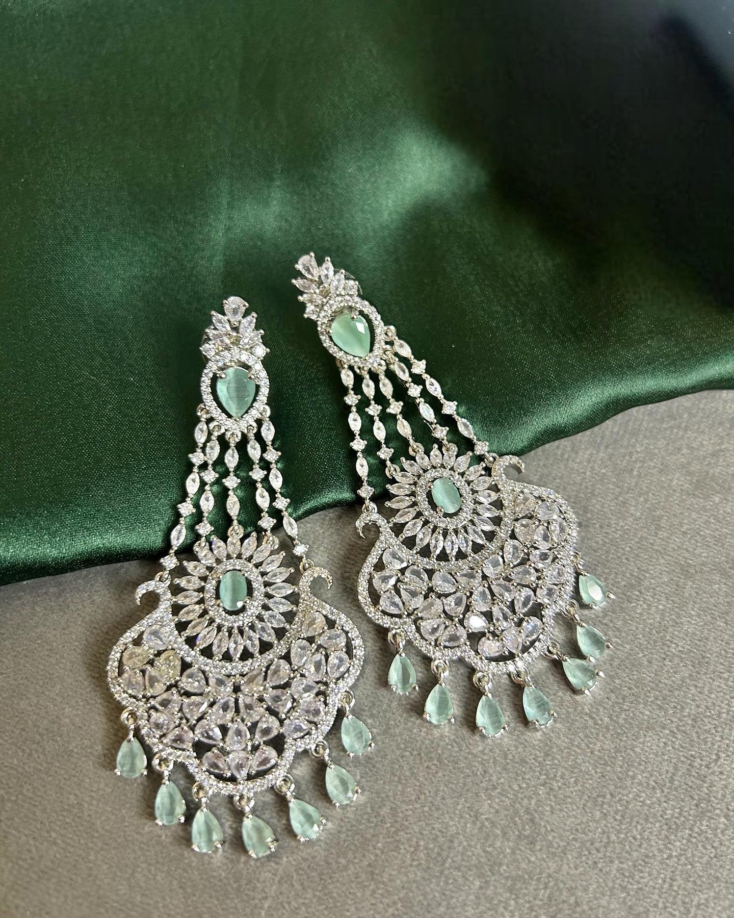 Elevate your style with Kiara's Mint Earrings. These modern, lightweight pieces are crafted with American diamonds, designed to add a touch of premium class to any outfit. Perfect for parties and western wear, these long and sharp earrings are a must-have for any fashion enthusiast.