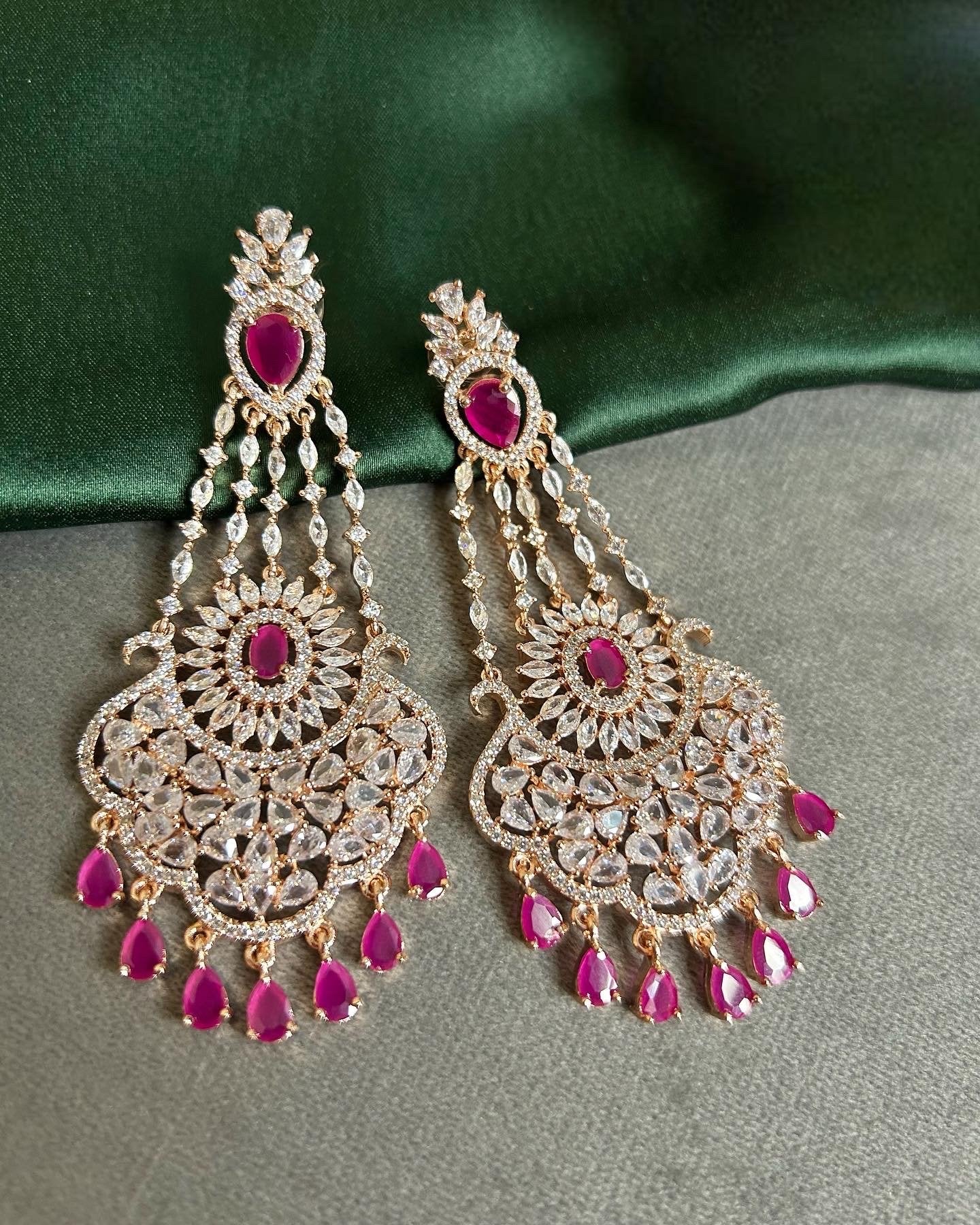 Elevate your style with Kiara's Ruby Earrings. These modern, lightweight pieces are crafted with American diamonds, designed to add a touch of premium class to any outfit. Perfect for parties and western wear, these long and sharp earrings are a must-have for any fashion enthusiast.