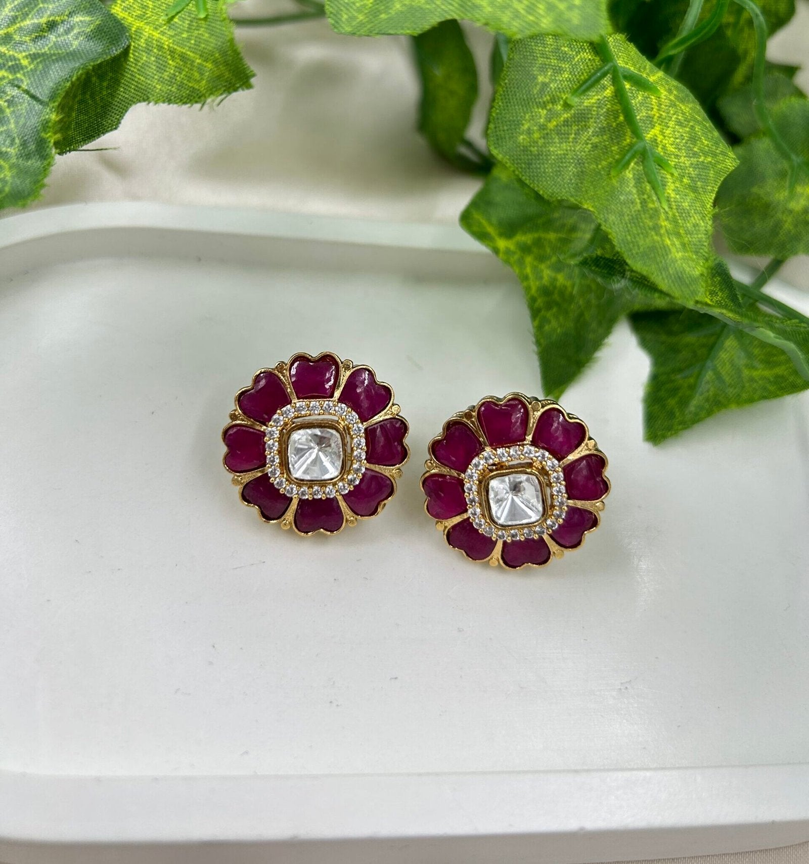 Elevate your style with our Kriti Studs in bold Ruby Color. Made with high-quality Kundan, these stud earrings exude luxury and sophistication. Perfect for making a bold statement and adding a touch of elegance to any outfit.