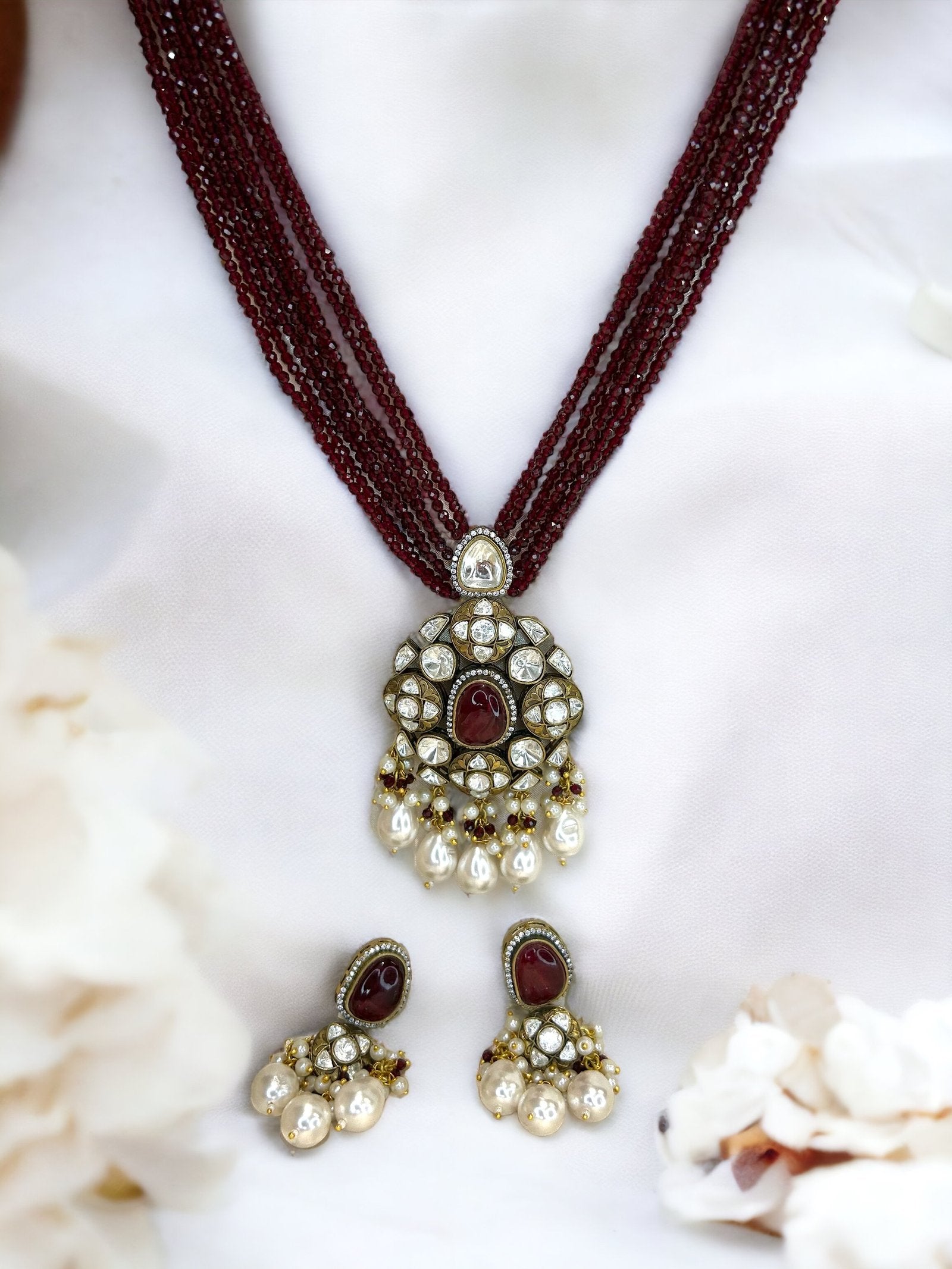 Long Maroon Polki: Necklace with Big Pearl Drops