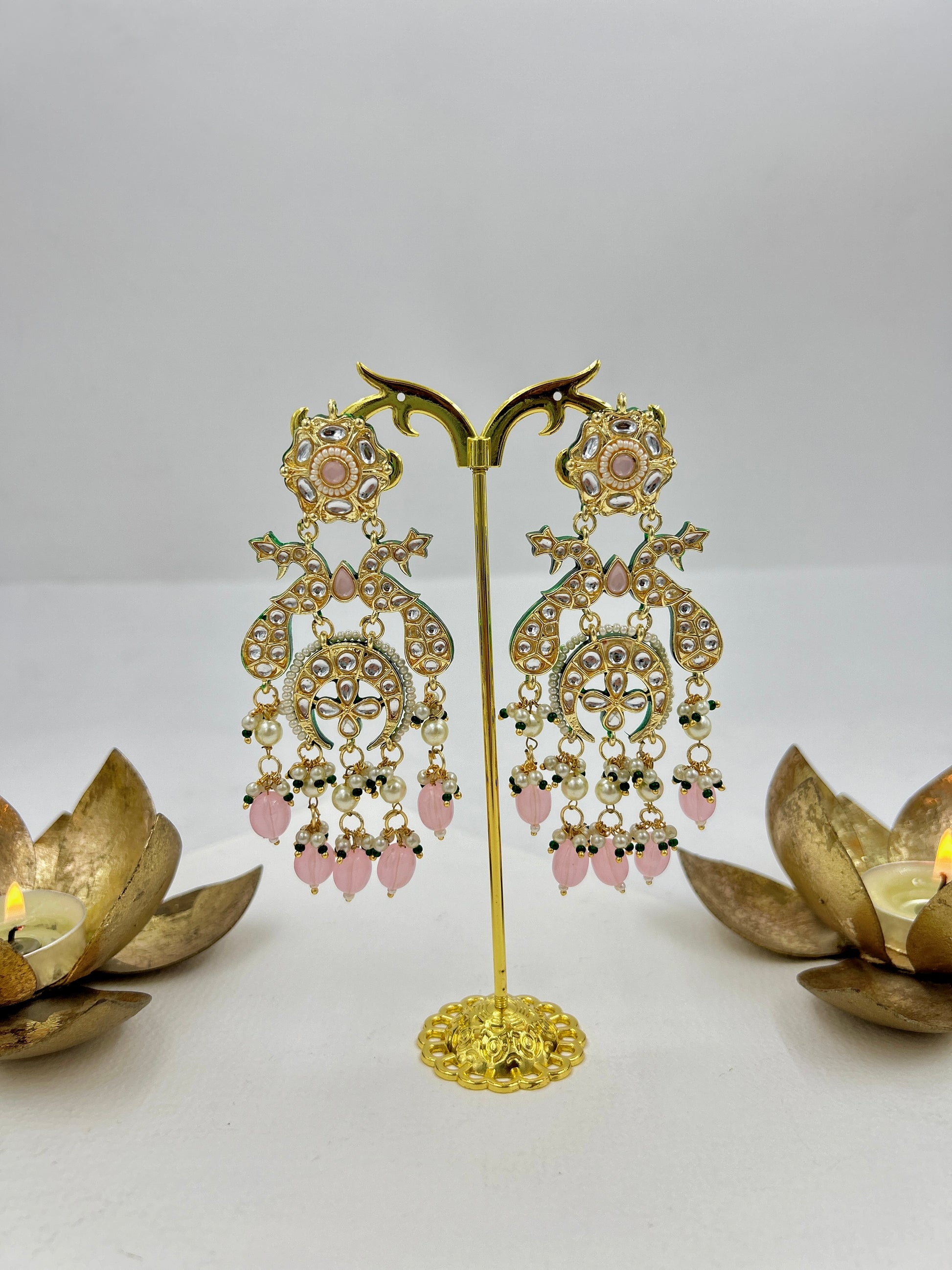 These Morika Earrings feature Kundan and a unique Peacock design with pearl detailing. Their exclusive design is both traditional and versatile, available in a variety of colors. Beautiful craftsmanship makes these earrings a must-have for any jewelry collection.