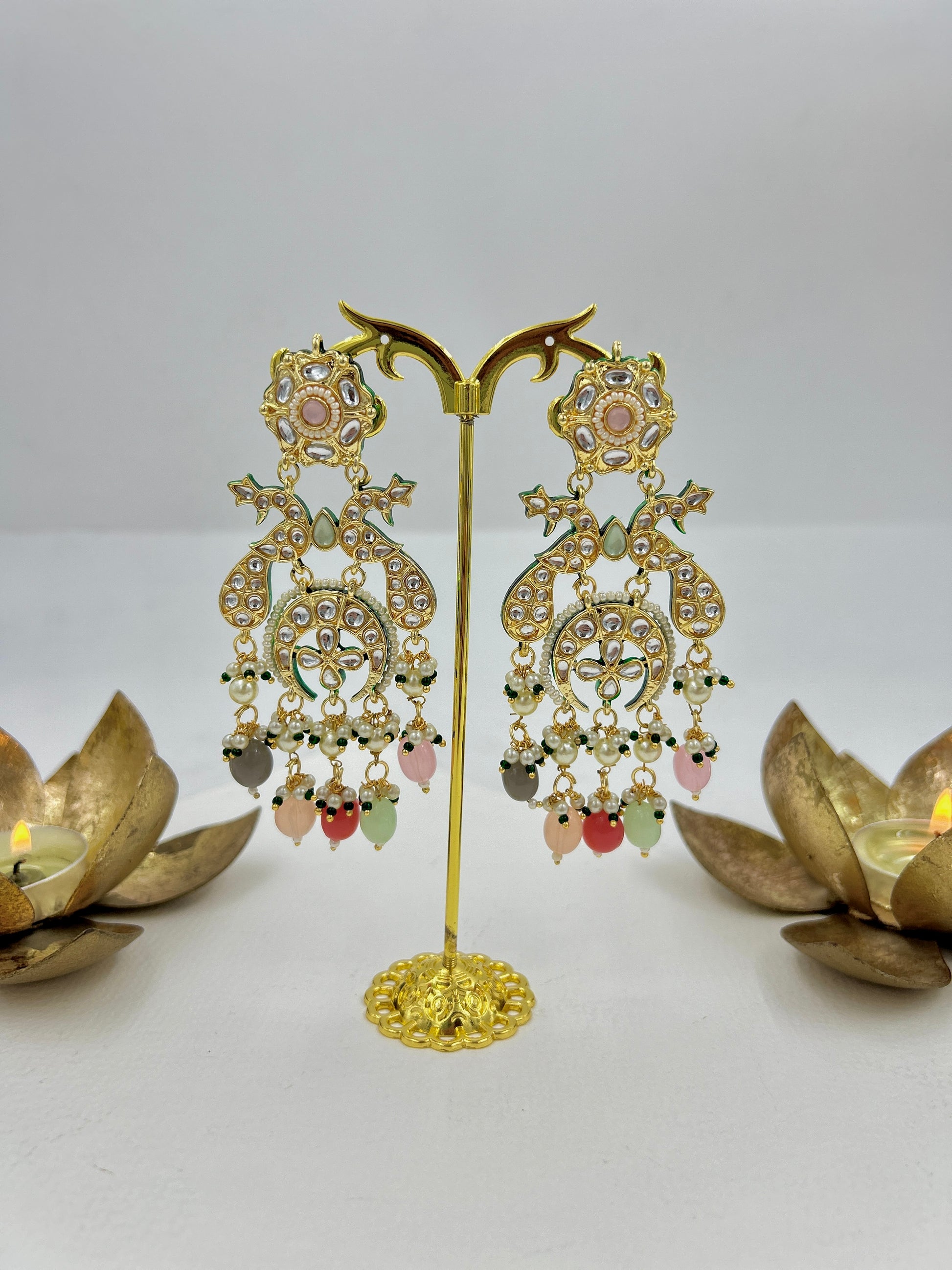 These Morika Earrings feature Kundan and a unique Peacock design with pearl detailing. Their exclusive design is both traditional and versatile, available in a variety of colors. Beautiful craftsmanship makes these earrings a must-have for any jewelry collection.