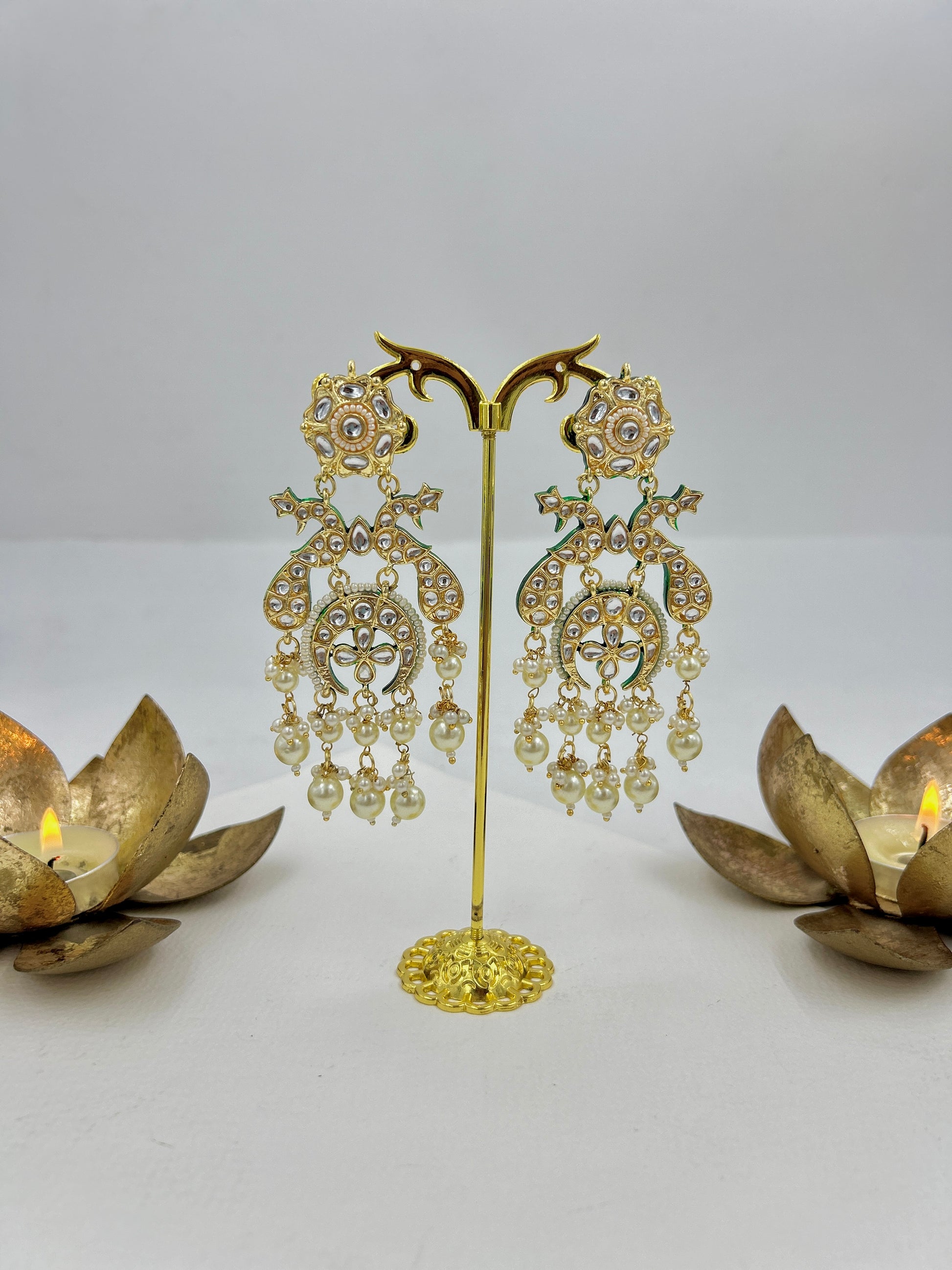 These Morika Earrings feature Kundan and a unique Peacock design with pearl detailing. Their exclusive design is both traditional and versatile, available in a variety of colors. Beautiful craftsmanship makes these earrings a must-have for any jewelry collection.