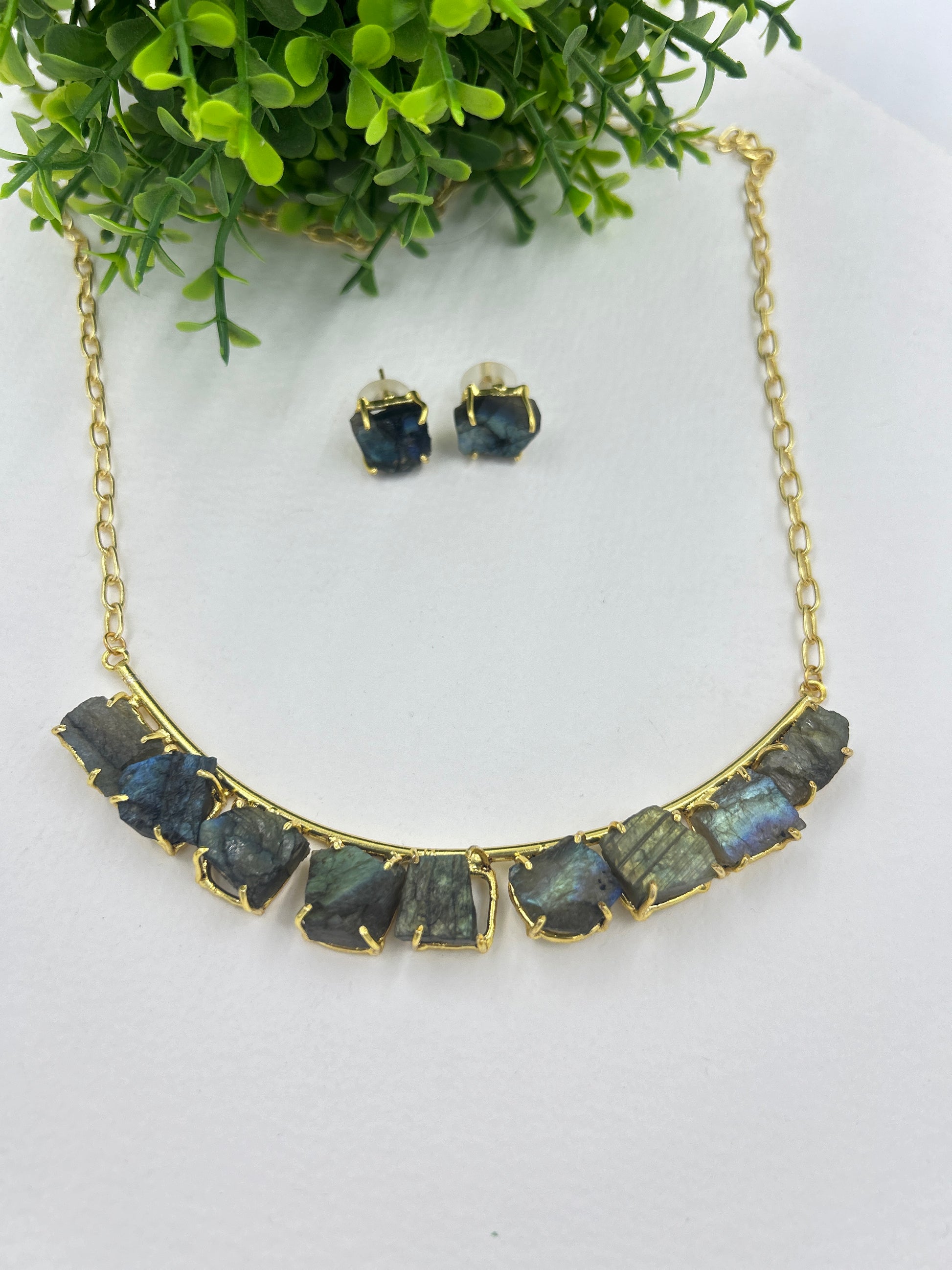 This exquisite Opal Neck Set in rough candy stones boasts a unique blend of indo western and contemporary design, delivering a premium elevated look. The high quality finish and matching necklace with studs make it a perfect addition to any outfit. Elevate your style with this stunning set.