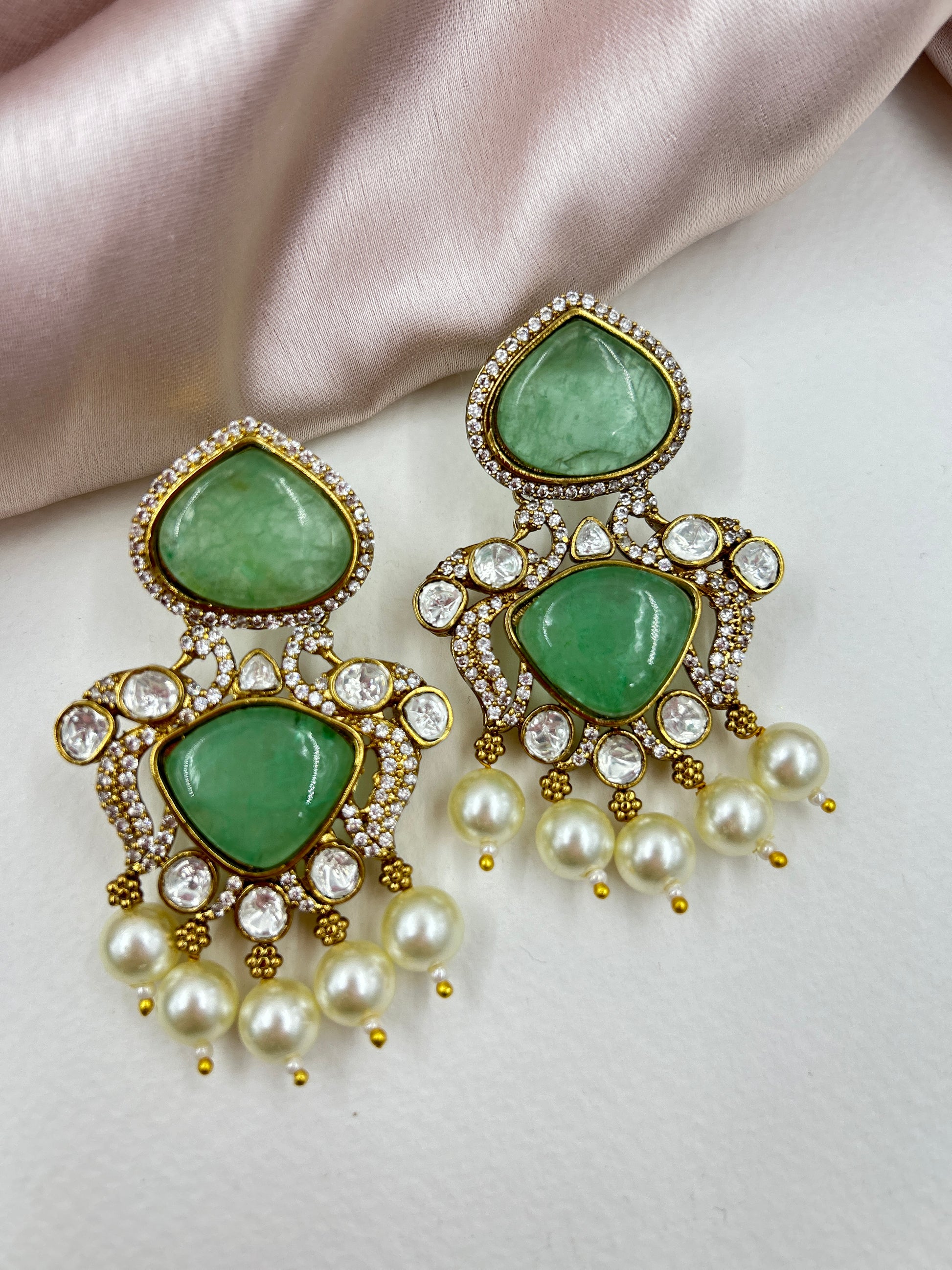 Expertly designed for timeless elegance, Qudarat Polki Earrings offer unparalleled quality with uncut polki stones and pearl drops. AD detailing and Doublet Stones add a touch of regality in antique polish for a truly classic look. Elevate any outfit with these top-notch earrings.