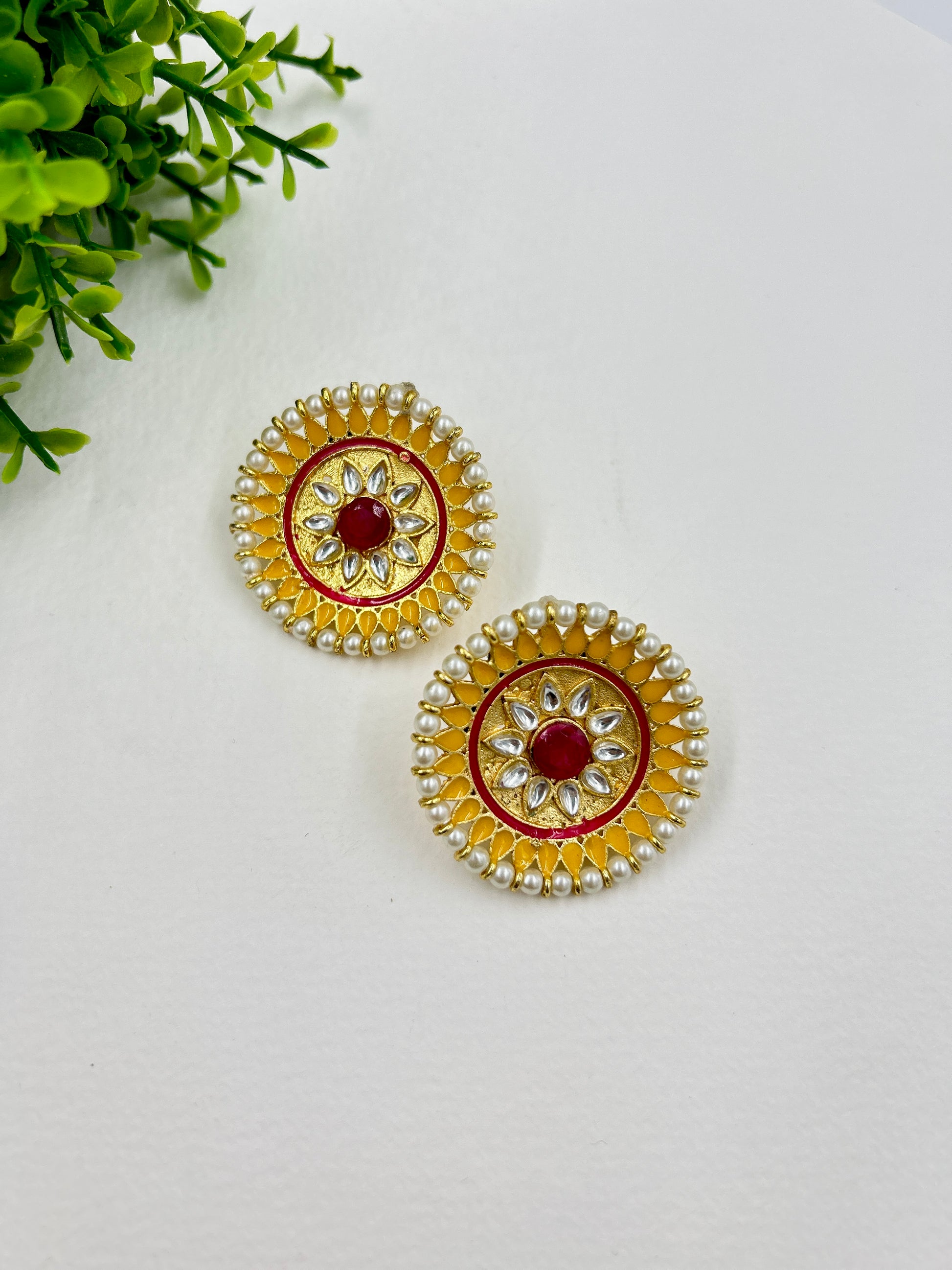 These elegant Rani Studs in yellow feature exquisite Kundan and Meenakaari detailing, complete with delicate pearl accents. Not only are they lightweight and comfortable to wear, but they also add a touch of glamour to any outfit. Perfect for any special occasion.