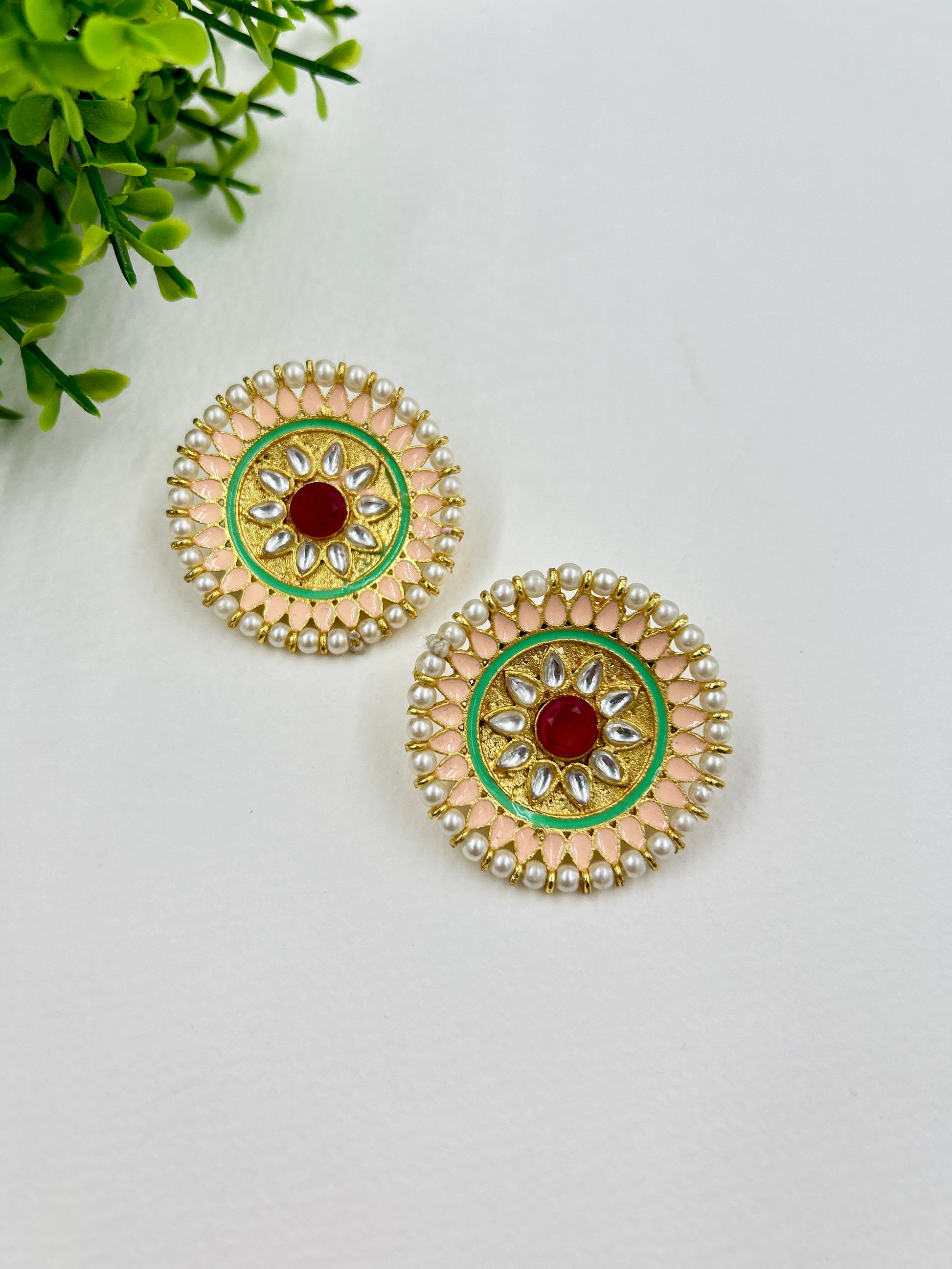 These elegant Rani Studs in peach feature exquisite Kundan and Meenakaari detailing, complete with delicate pearl accents. Not only are they lightweight and comfortable to wear, but they also add a touch of glamour to any outfit. Perfect for any special occasion.