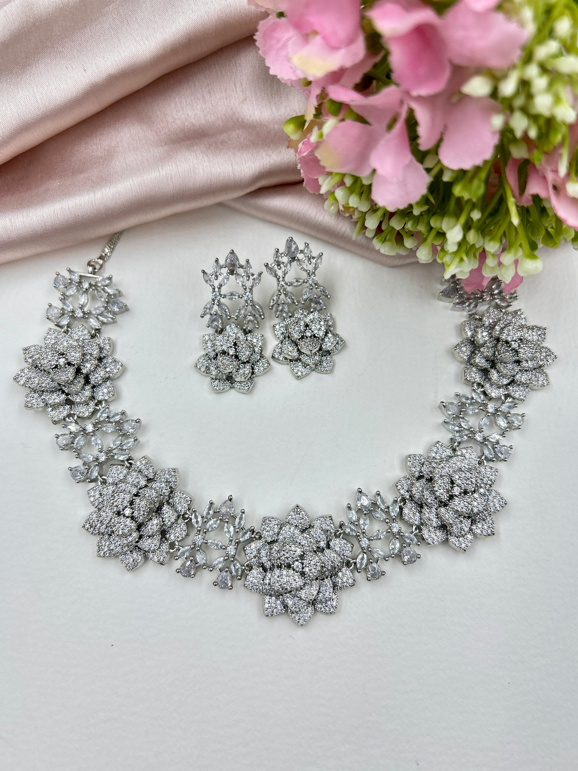 This Rosette AD Necklace boasts a stunning design with high-quality American diamonds and a silver rhodium polish. Expertly crafted with precision and care, this necklace will make a statement of elegance and sophistication. Guaranteed to elevate any outfit, this necklace is perfect for any special occasion.
