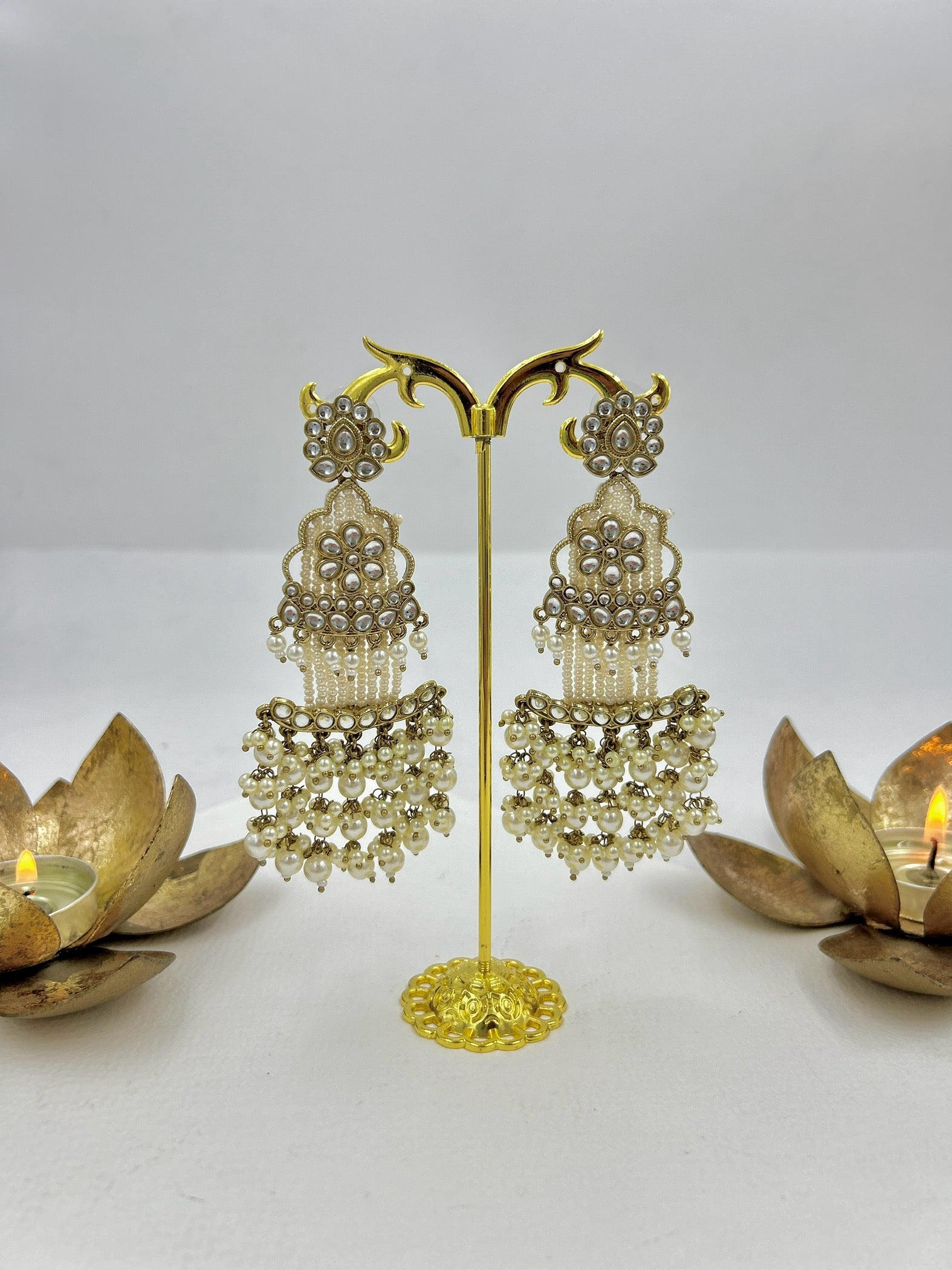 These handcrafted Rukmini Earrings feature a stunning combination of kundan and pearl detailing, inspired by the Mughal era passa design. With a unique concept and twin color combination, these earrings will elevate any outfit with elegance and sophistication. Perfect for those looking for a statement piece that exudes traditional charm.