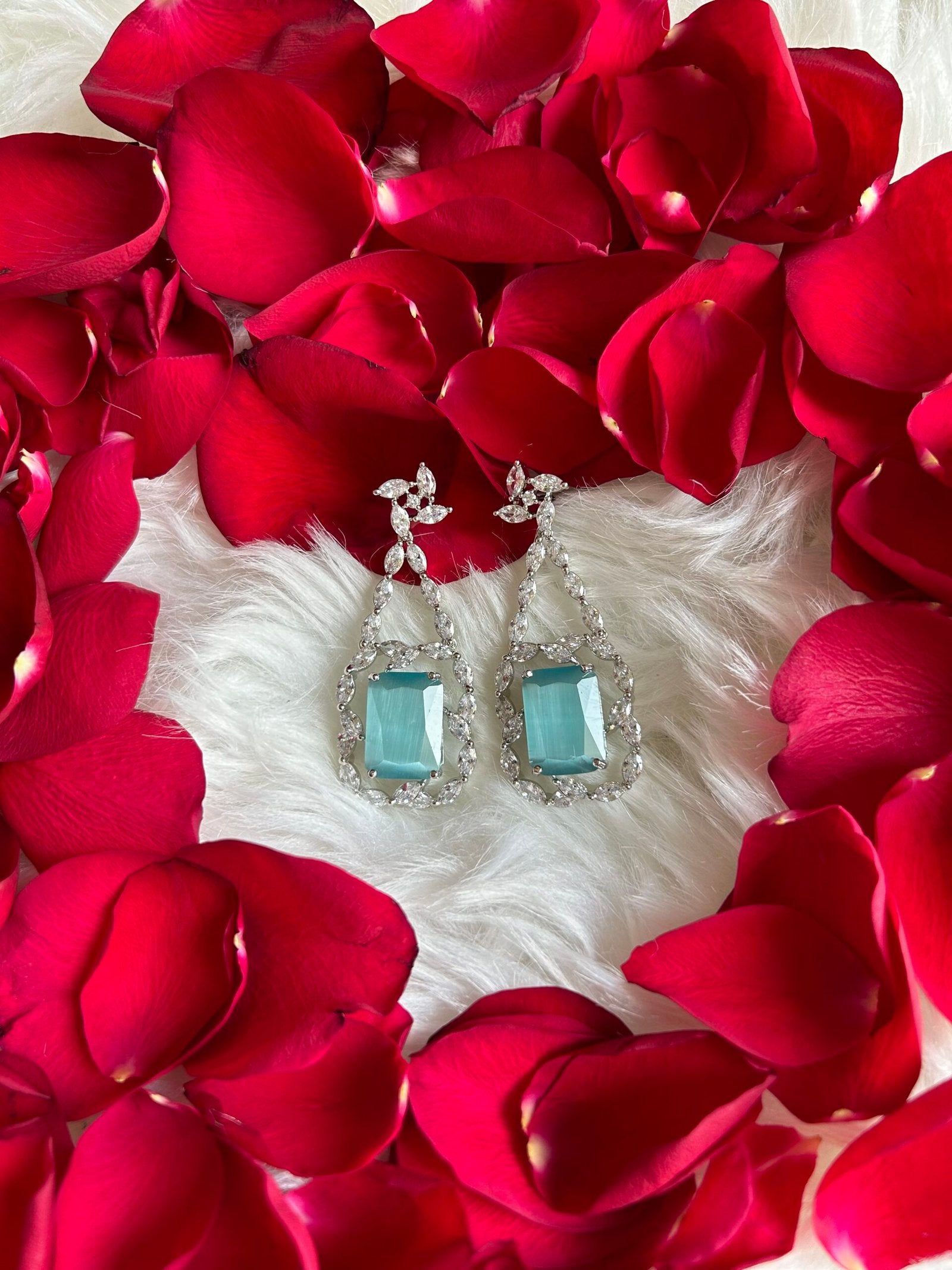 Introducing Scarlett: Earrings - Sky. These earrings feature sharp cuts and high-quality American diamonds, perfect for adding a touch of modern and classy elegance to your western wear. The incrinate design complements any outfit, making these earrings a must-have for any fashion-forward individual.