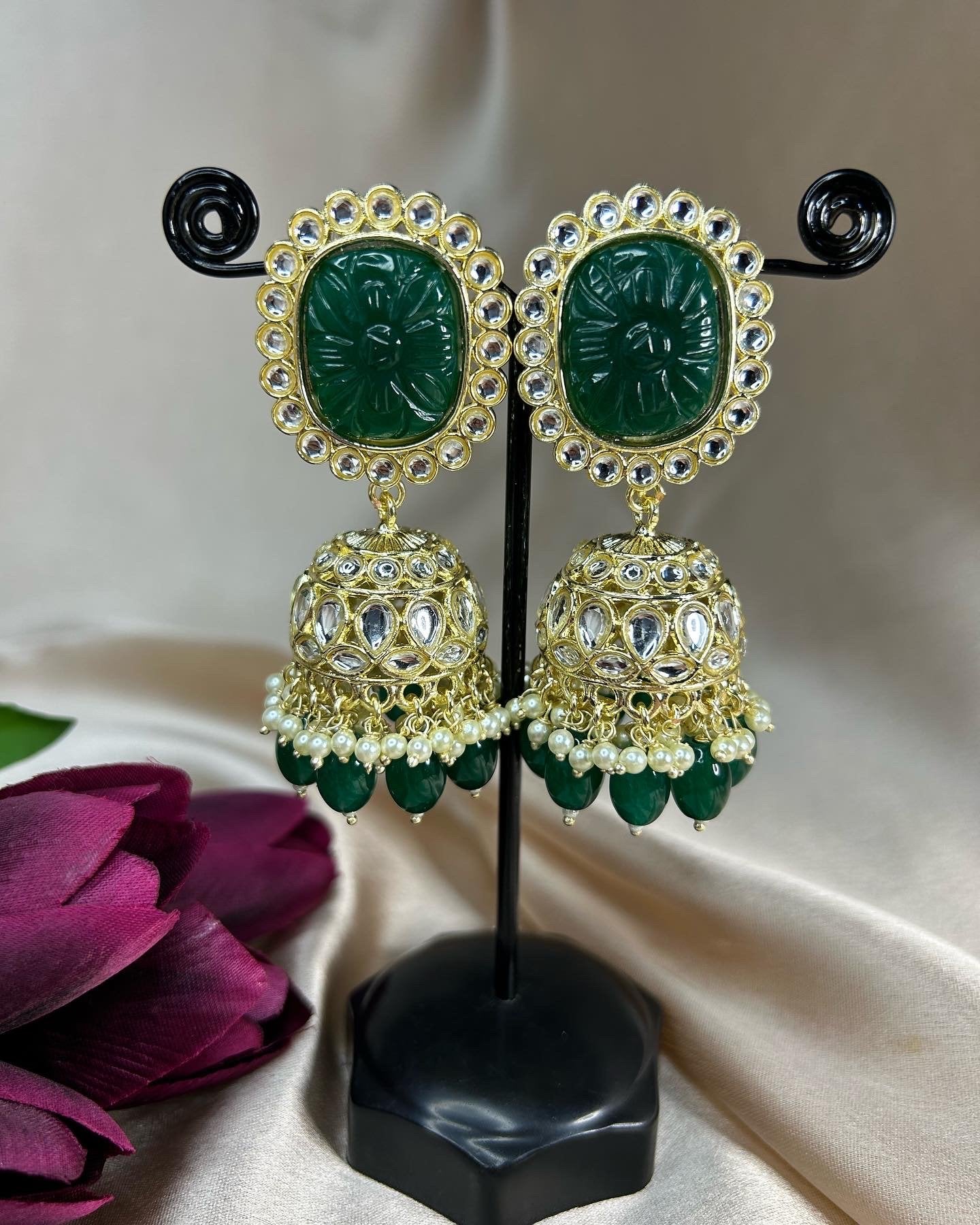 The Simar Jhumki earrings feature exquisite Kundan detailing, adding an elegant touch to any outfit. Crafted with a classic Jhumki design, these earrings are perfect for adding a touch of traditional charm. Elevate your style with these beautiful charcoal Jhumkis.