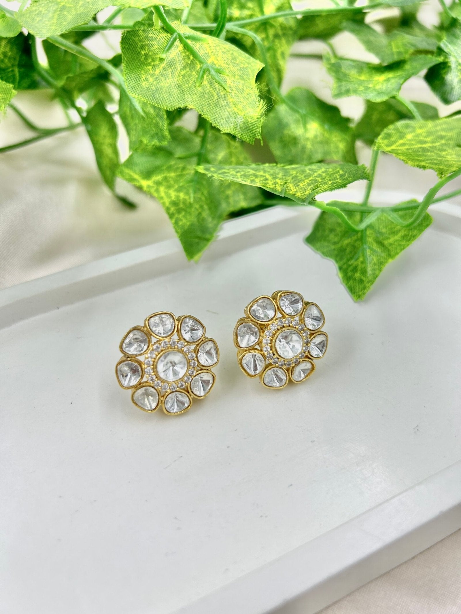 Enhance your style with these exquisite Tripti Studs featuring luxurious AD and Polki Kundan. These minimalist yet classy stud earrings will make you stand out in any crowd. Elevate your look with the perfect touch of elegance and sophistication.