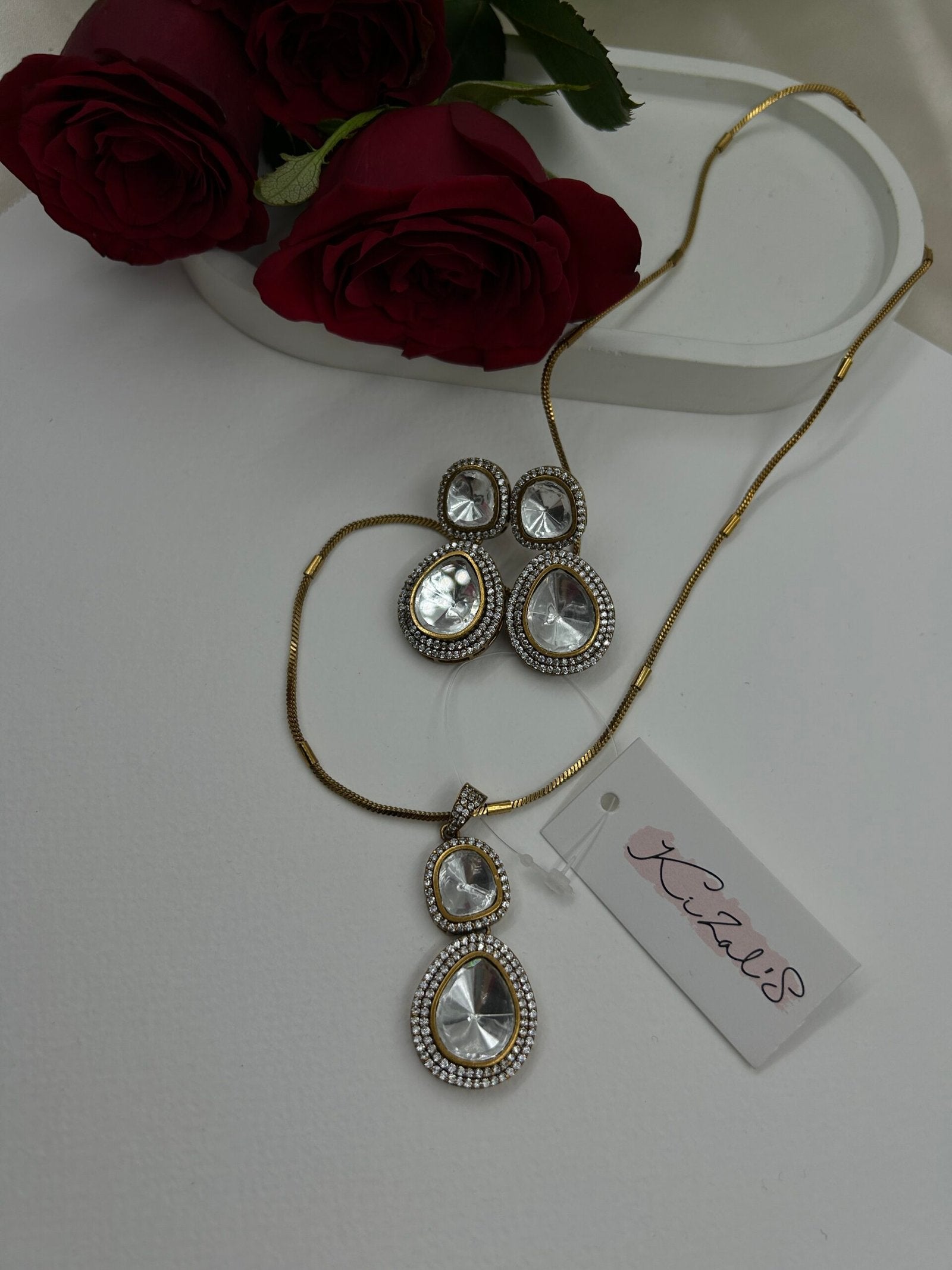 Expertly crafted with traditional Polki and sparkling American diamond, the Uma Polki Pendant Set radiates elegance and sophistication. Its antique gold-lookalike adds a touch of vintage charm to any outfit. Elevate your style with this exquisite piece.