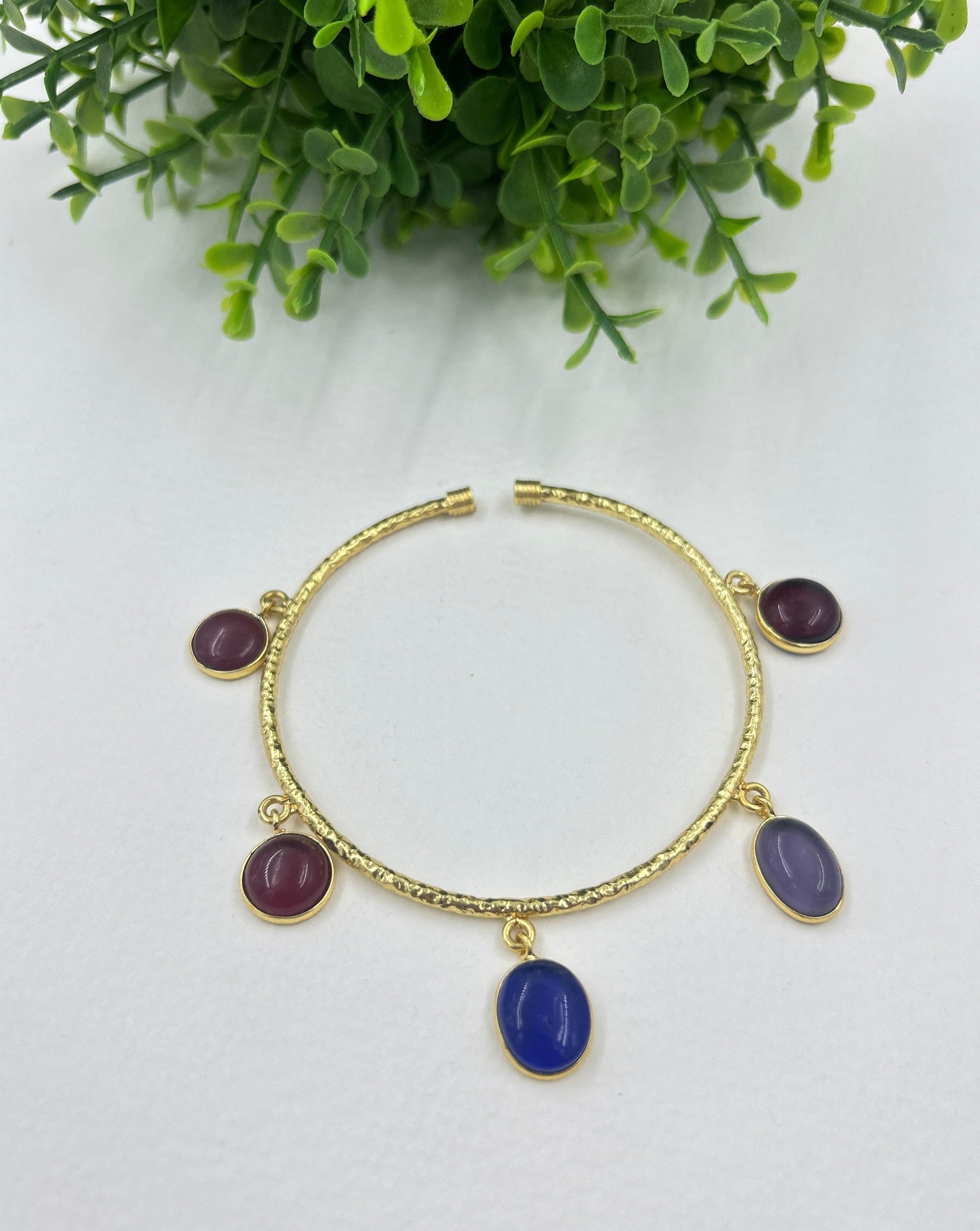 This Vatsala bracelet combines Indo western design and contemporary style for a unique and stunning accessory. The adjustable feature ensures a perfect fit for any wrist. The high quality gold finish and lovely multi color stones make it a beautiful and versatile piece. Its light weight allows for comfortable wear all day.