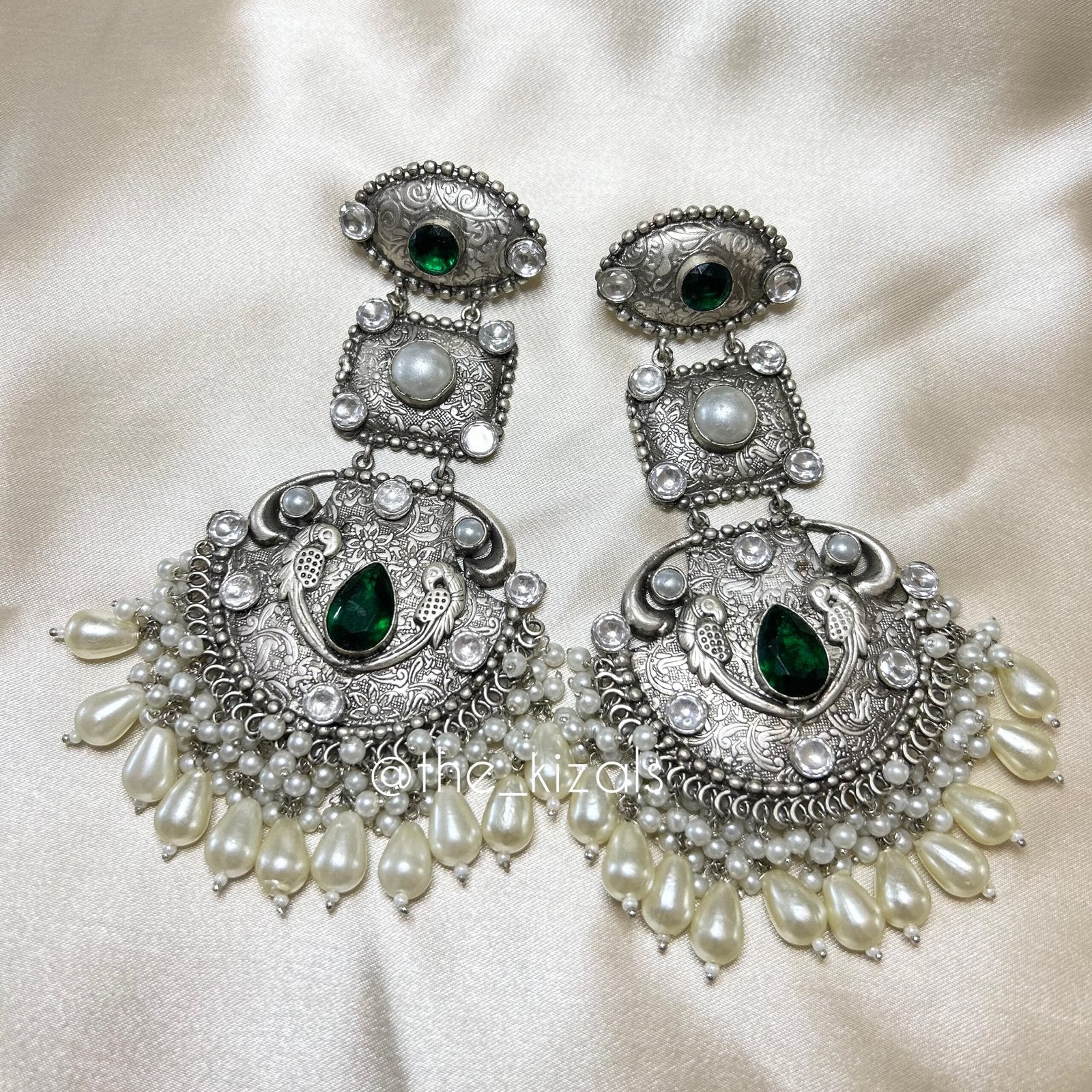 These Zoha earrings are a perfect addition to your festive wear collection. Made of German silver, they exude a Nawabi charm and feature pearls that add elegance. Ideal for Navaratri and Eid celebrations, these earrings are a must-have for any occasion.