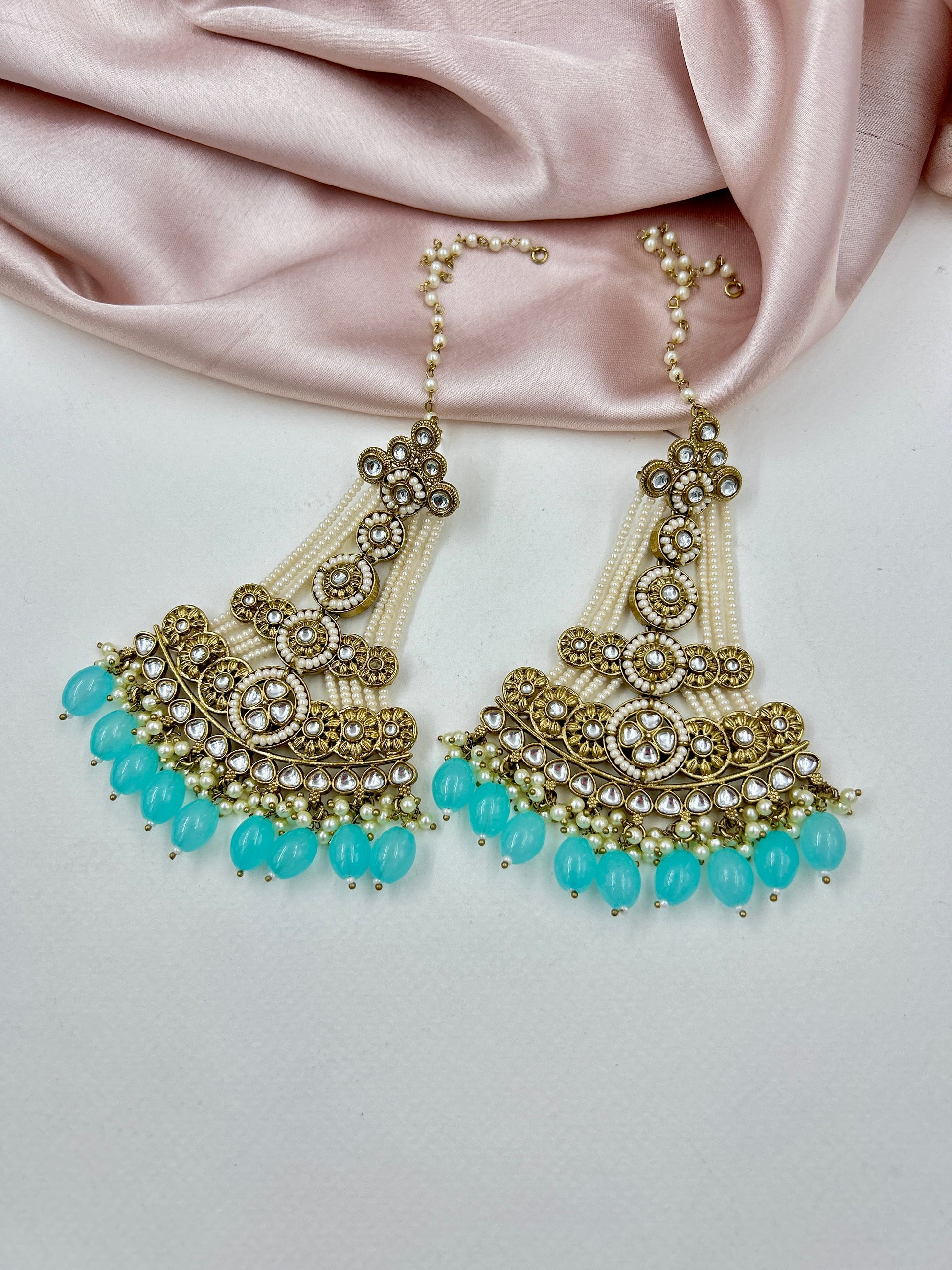 Elevate your style with our Zubeda Passa Earrings. These elegant statement pieces are crafted with pearl detailing and kundan work, embodying a timeless and regal charm. The passa style and mehendi polish accentuate any outfit, making it a must-have accessory.